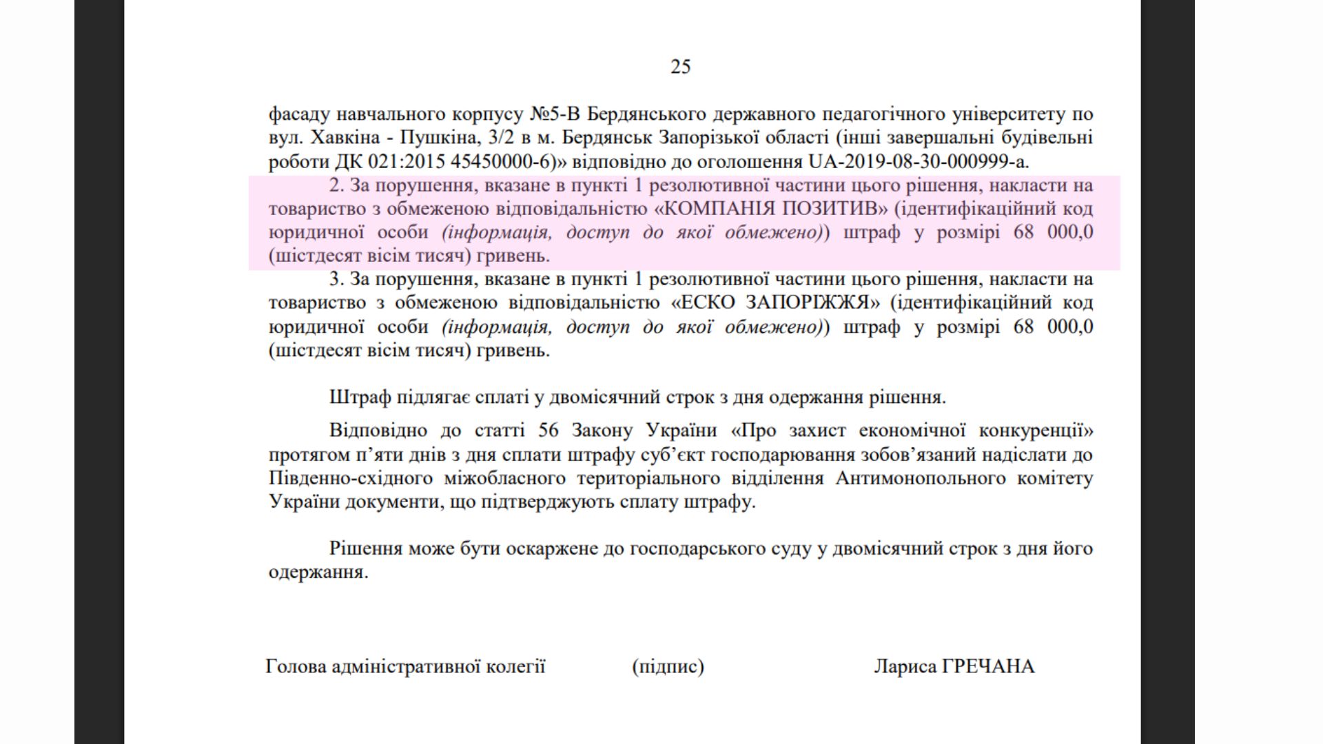 У торгах тоді взяли участь ці дві фірми «Позитив» та «Еско Запоріжжя». Перемогу здобув «Позитив». Згодом, у квітні 2025 року, Антимонопольний комітет визнав, що ці компанії діяли узгоджено, чим спотворили результати закупівлі. На кожну з фірм наклали штраф у розмірі 68 тисяч гривень.