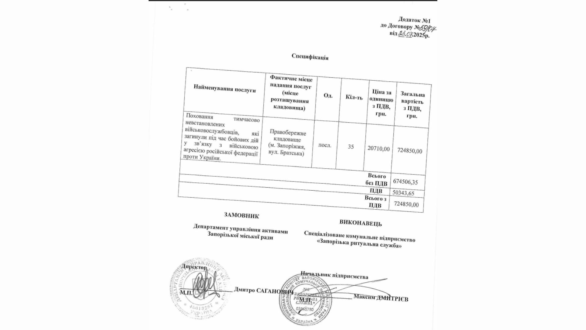 У Запоріжжі за останні місяці для поховання та встановлення пам’ятників виділили декілька мільйонів. Проте у договорах не розписують, на що саме витрачаються кошти. У документах зазначається лише загальна послуга без конкретизації матеріалів чи робіт.