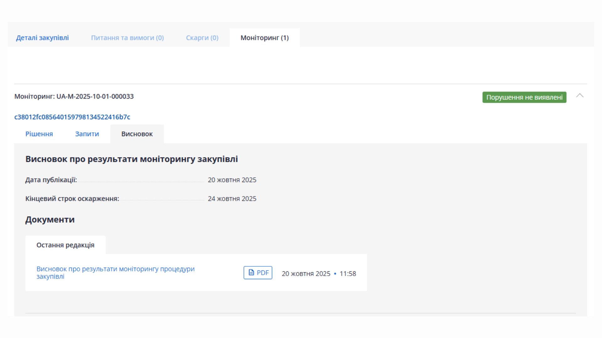 Наразі закупівлею зацікавилася Державна аудиторська служба. Моніторинг триває.