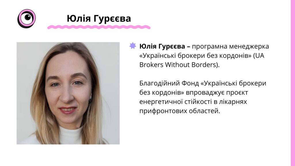 Забезпечити енергетичну стійкість лікарень допомагають фонди й донори. Зокрема, редакція SODA поспілкувалася з Юлією Гурєєвою, програмною менеджеркою Благодійного Фонду «Українські брокери без кордонів». Юлія продовжує думку експерта: