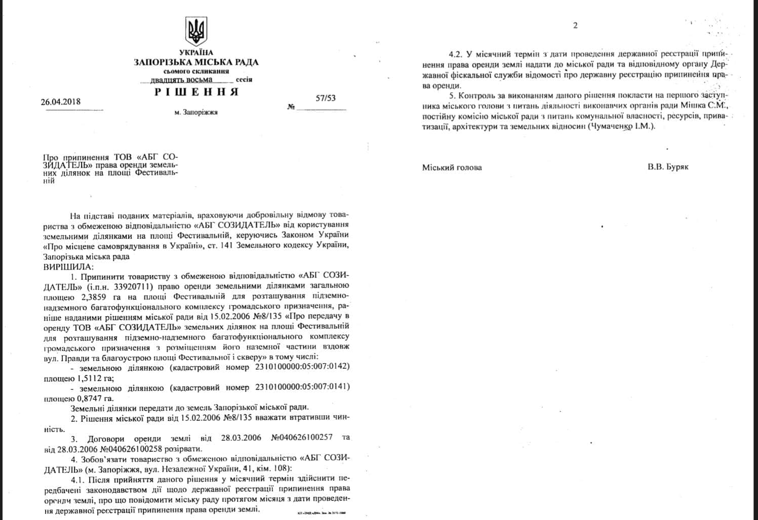 Суттєві зрушення розпочалися аж через 12 років, а саме у 2018 році. Однак, далеко не будівельного характеру. У лютому Запорізька міська рада прийняла новий план зонування території міста. За ним земельні ділянки на площі Фестивальній віднесли до категорії «Громадсько-ділова зона загальноміського значення». Тому будівництво вищезазначених об’єктів відповідно норм цього плану не дозволяється. А вже у травні міськрада на черговій сесії приймає рішення розірвати з «АБГ-Созидатель» договір про оренду. При цьому у документі рішення прописано, що підставою для цього стала добровільна відмова фірми.