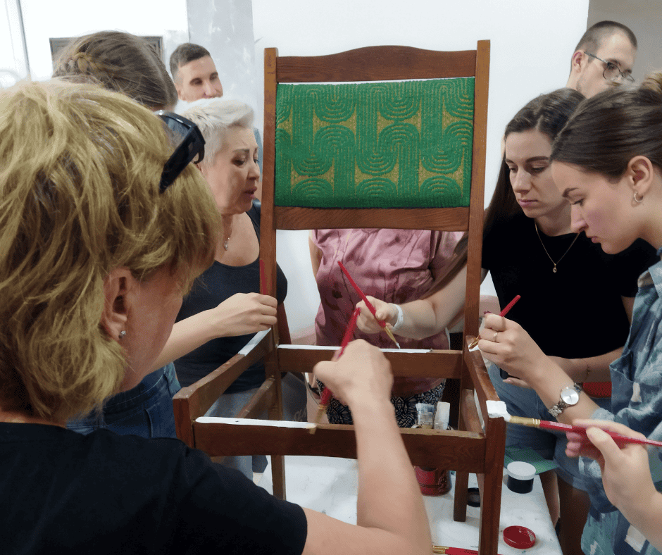 Для сьогоднішньої лекції вона обрала саме редизайн стільців, адже це набагато простіше ніж реставрація. Для цього процесу не обов’язково потрібна ідеальна деревина, і цим легко можна займатися вдома.