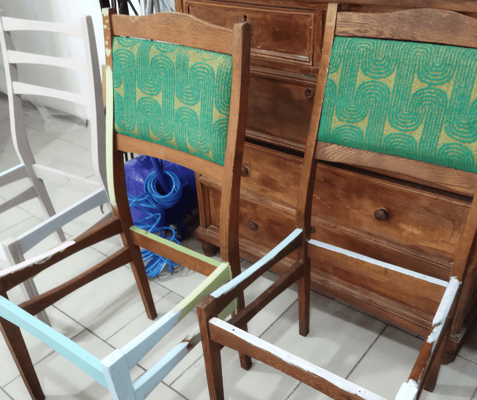 Після фарбування можна переходити і до м’якої частини стільця. практики трошки поговорили про м’яку частину меблів. При заміні оббивки часто лишаються дірочки які краще зашпаклювати пилом з деревини та клеєм або ж зубочистками та клеєм, щоб під час кріплення туди не провалювалися скоби.