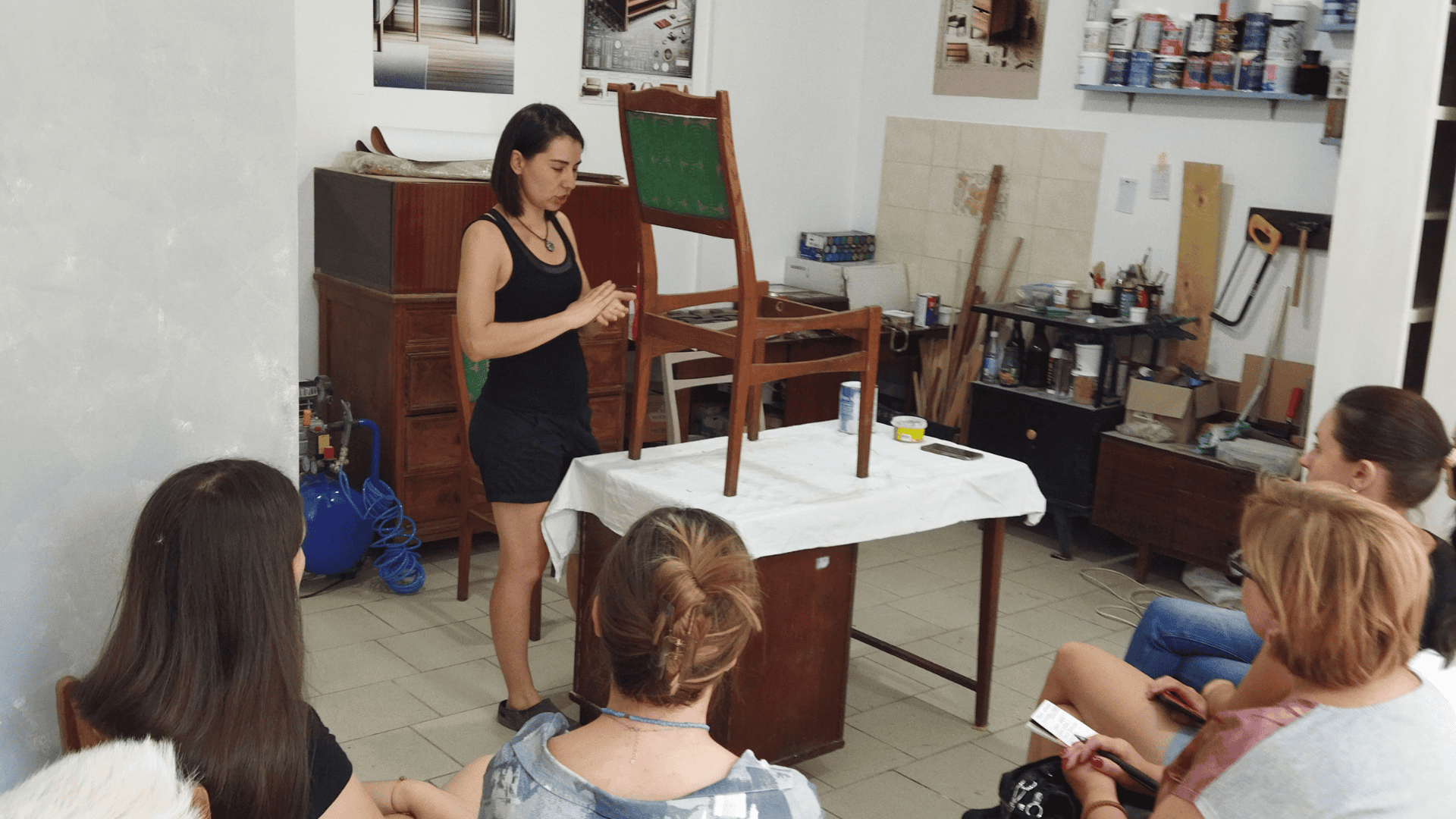 Прийшовши у затишну світлу майстерню, ми одразу сідаємо на свої місця. Майстер-клас починається зі знайомства. Лекторка та власниця майстерні, усміхнена дівчина на ім’я Катерина, трохи розповідає про себе і відразу переходить до справи – пояснення різниці між редизайном та реставрацією.