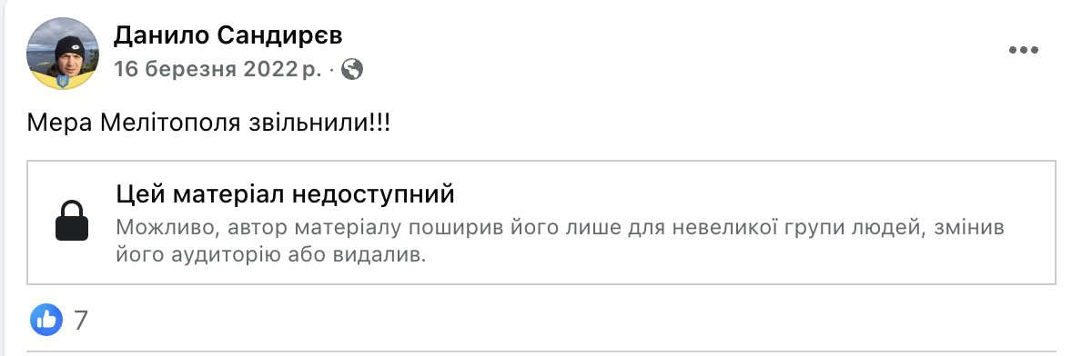 Тоді Іван Федоров був міським головою Мелітополя, повідомлялося, що 11 березня під час роботи в кризовому центрі він був викрадений окупантами. 16 березня його звільнили з полону. На це Данило Сандирєв теж зреагував.