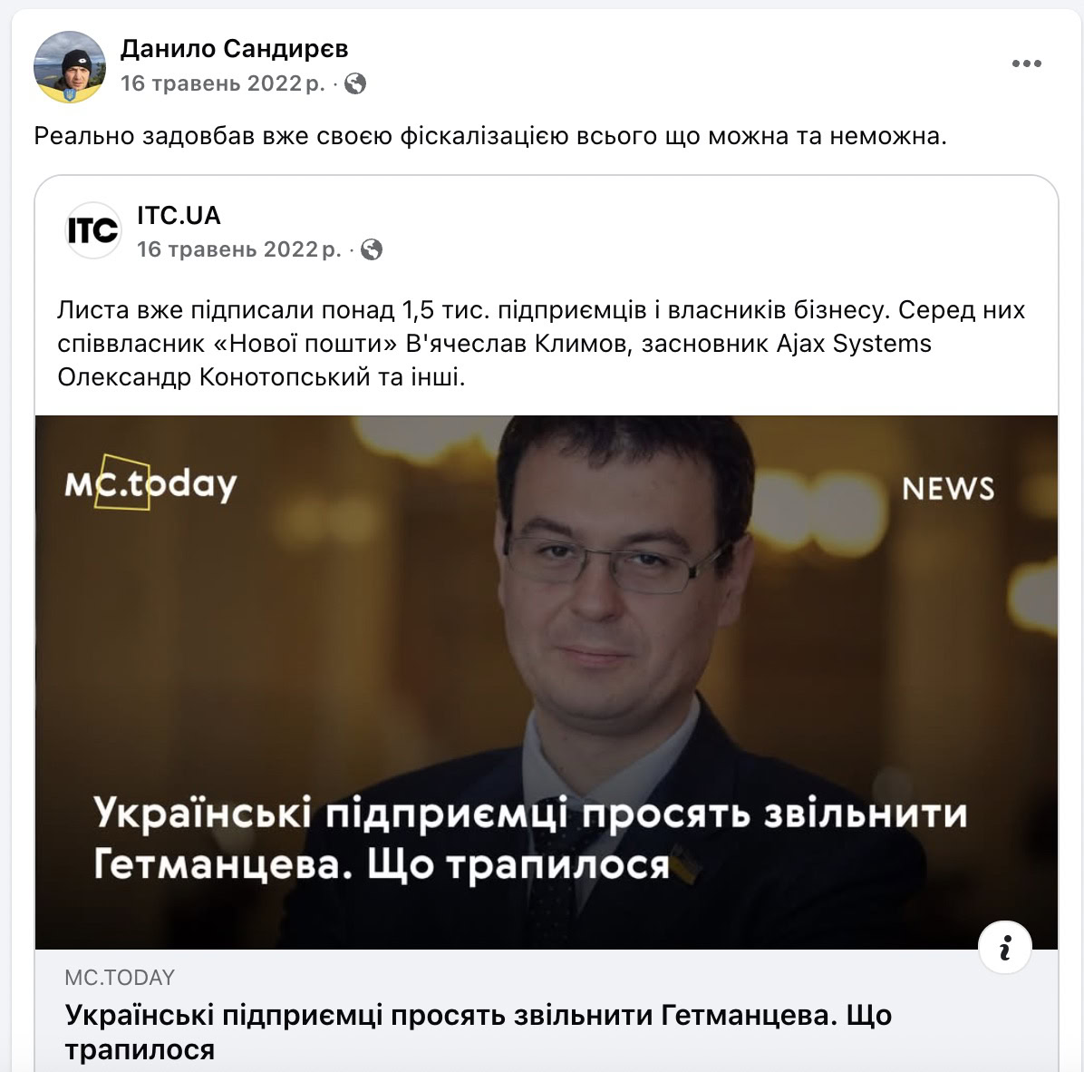 Окрім цього, на сторінках власника «Кальміуса» мало інформації про особисте. З моніторингу соцмереж додамо лише публікацію від травня 2022 року про незадоволення фіскалізацією.