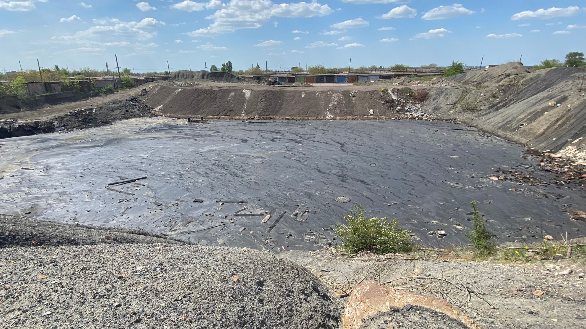 Перед нашими очима вражаюче видовище — котлован з вʼязкою чорною речовиною, вкритою зверху невеликим шаром води після дощу, і з купою різного сміття.