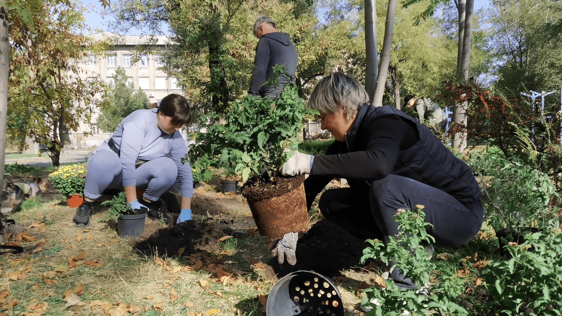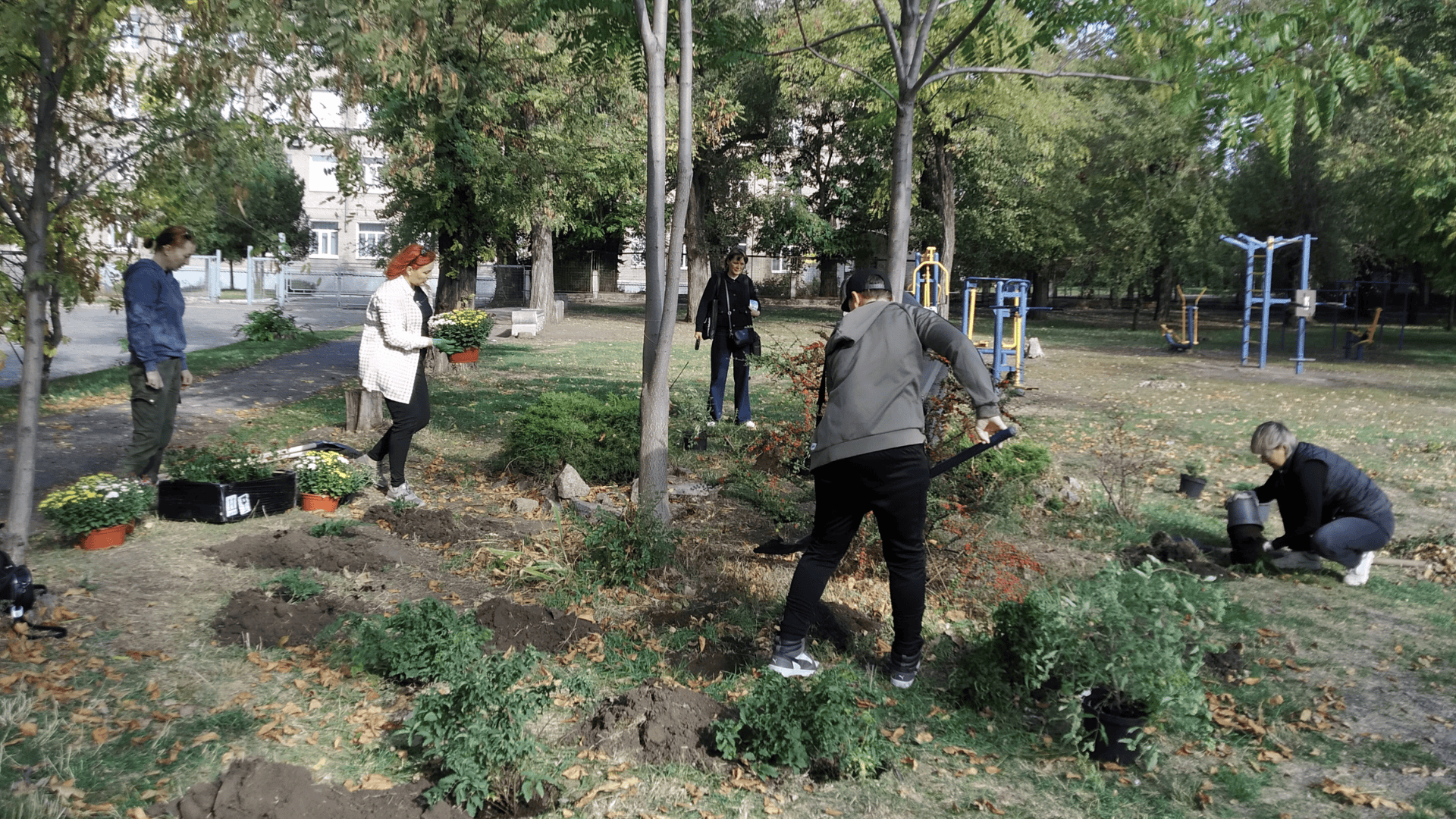 У «Зелений парк» перед школою №52 вже потроху прибувають люди з робочим інвентарем. Розкладаємо квіти, паралельно знайомлячись. Виявляється, майже всі учасники – мешканці Зеленого Яру. Тільки одна жінка приїхала здалеку, побачила оголошення у соціальних мережах та вирішила допомогти.