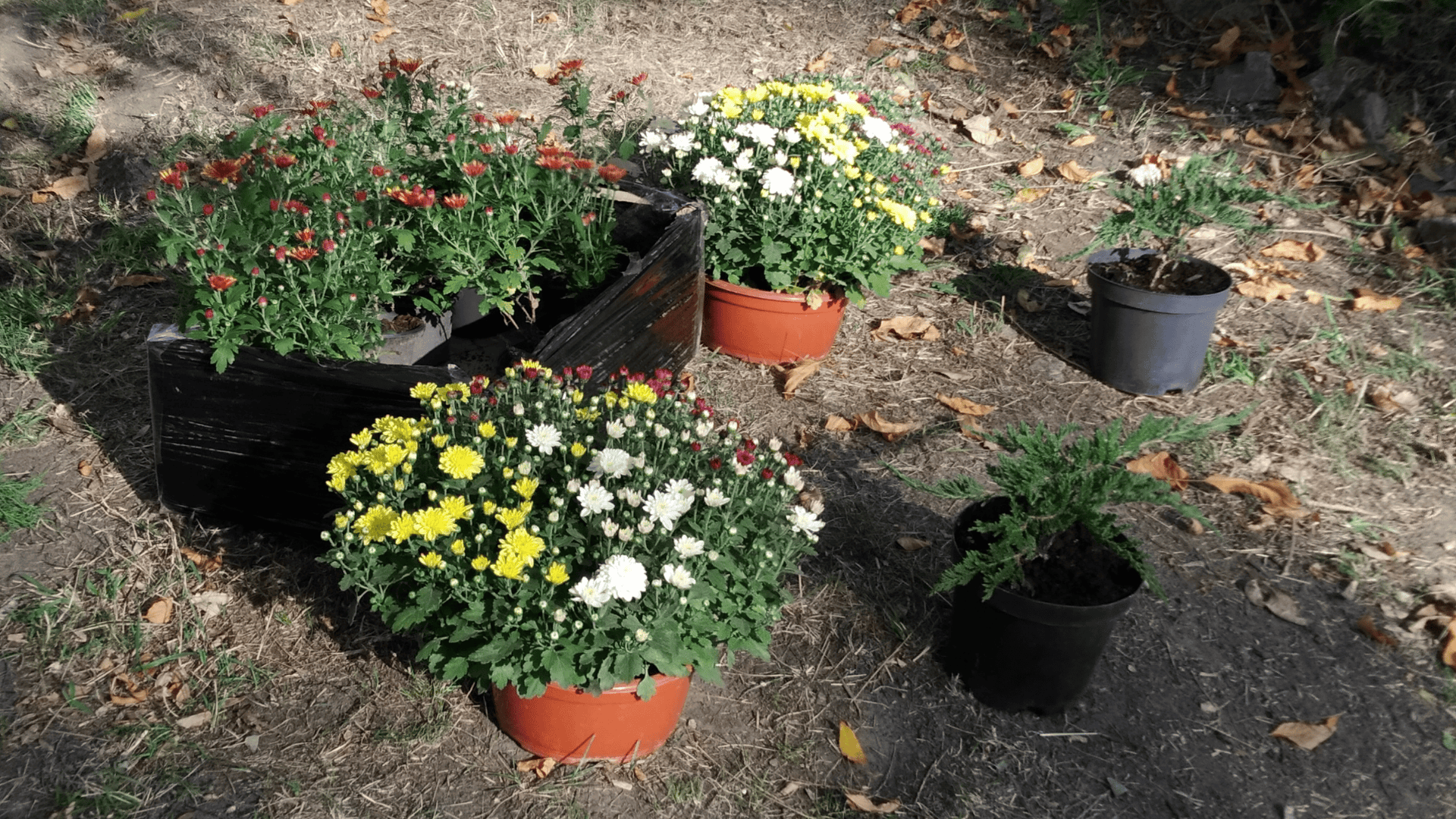 Отримав чіткі інструкції з висадки, складаємо композицію клумби. Розкладаємо по місцях каріоптеріс, хризантеми, мультифлору, ялівець та дуже гарну спірею.