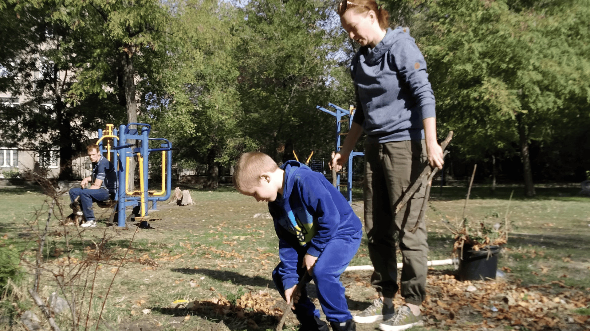 Оглядаємось. «Зелений парк» зовсім маленький. Як нам згодом пояснили, за розміром це, насправді, сквер. Дитячий майданчик, спортивні тренажери, лавочки та безліч різноманітних рослин. Бачимо дубок та калину, а по території розкидані клумби. Одну з них ми будемо відновлювати.