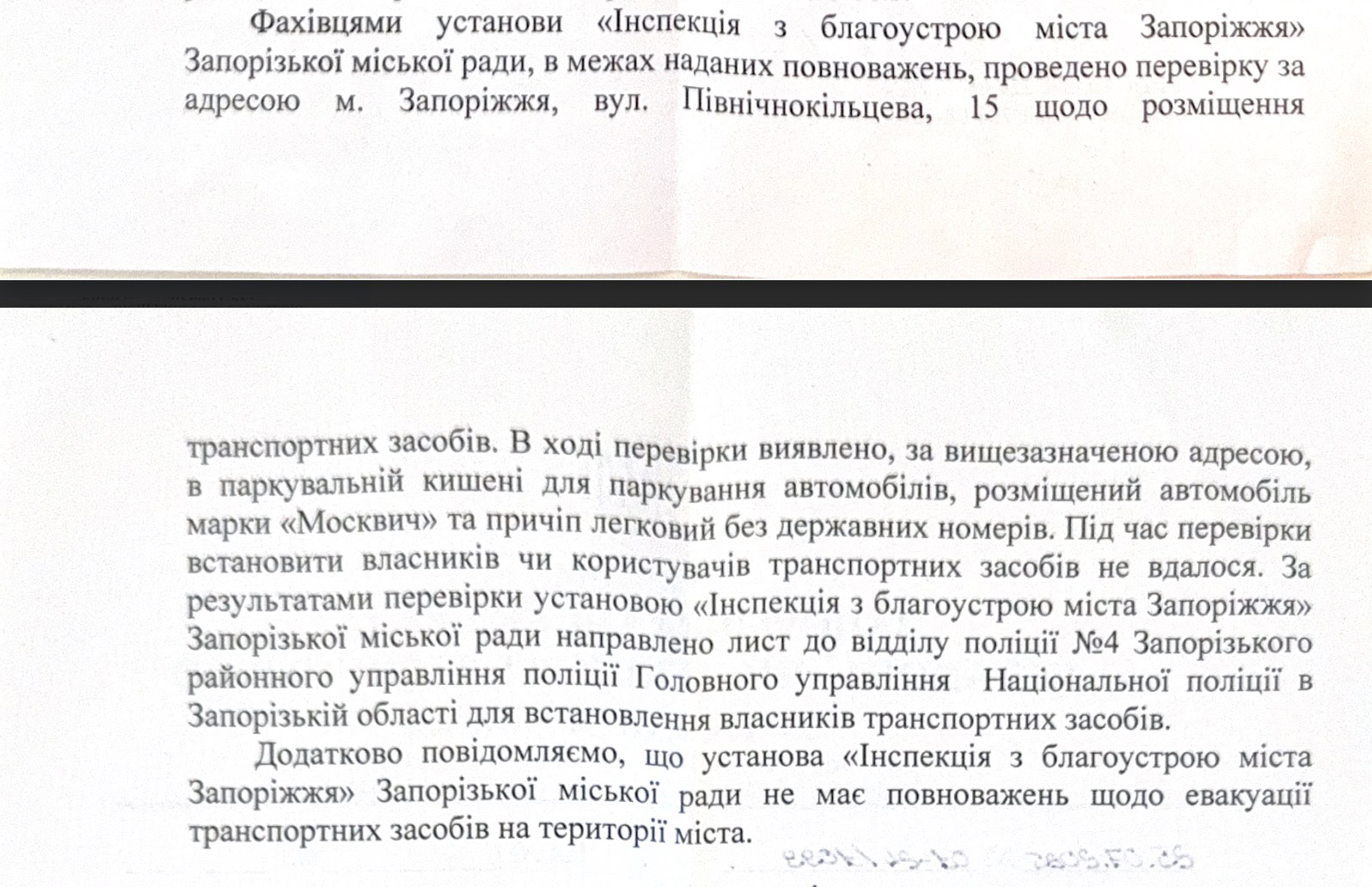 Тож 26 червня ми відправили скаргу, а через місяць отримали листа, в якому йшлось, що інспекція провела перевірку і виявили «Москвич» та причіп без державних номерів. Знайти власників не вдалося, тому інспекція відправила лист до Нацполіції для їхнього встановлення.