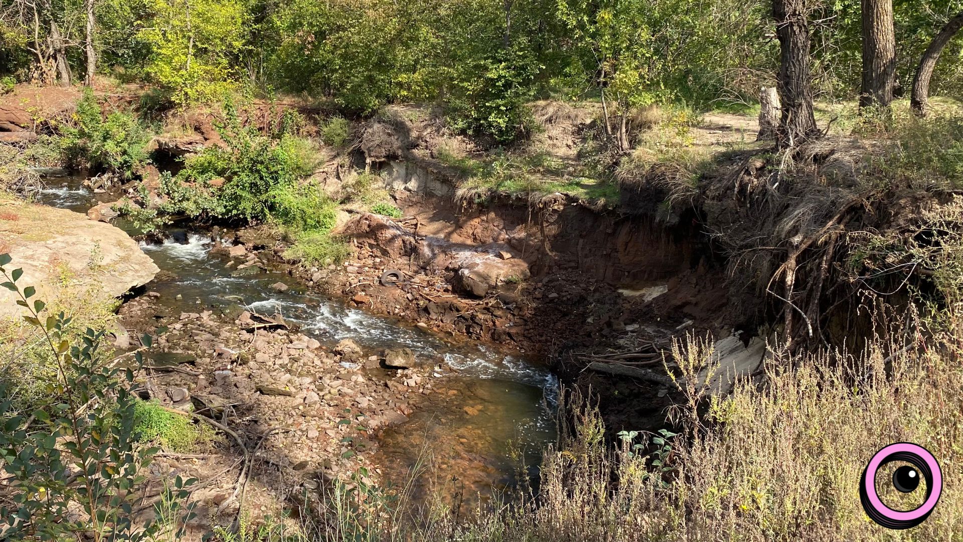 Через стрімкий потік Сухої, береги руйнуються просто на очах. Там, де раніше був пологий, безпечний спуск, зараз стрімкі обриви, а ґрунт під ногами ризикує обвалитися в той момент, як тільки на нього ступиш.