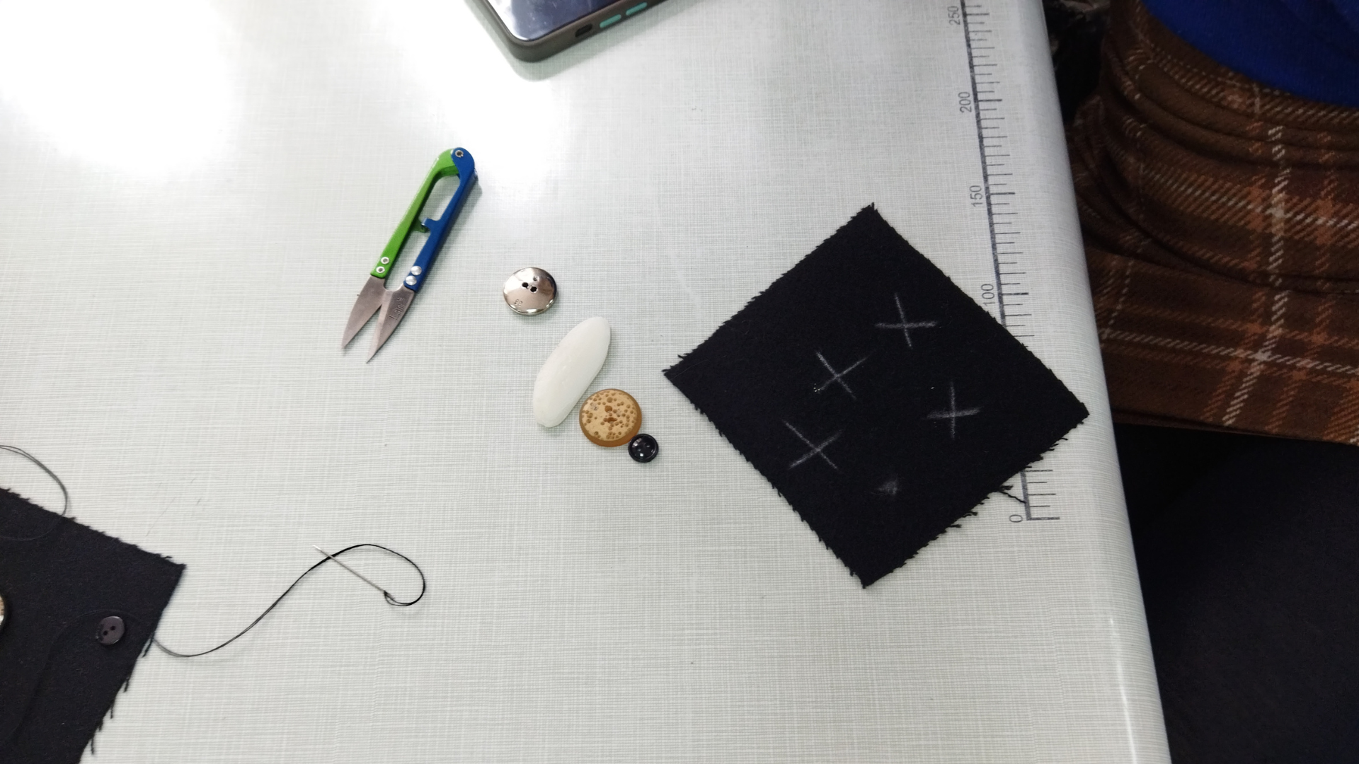 Учасники відмічають місця. Віталія пояснює, що спочатку треба пришити підґудзичник, а потім вже сам ґудзик. Щоб ґудзик виконував свою функцію правильно і не притискав занадто сильно тканину, йому треба зробити ніжку.