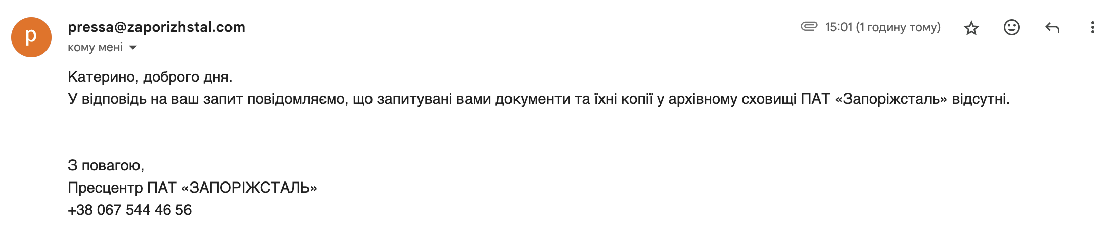 – У відповідь на ваш запит повідомляємо, що запитувані вами документи та їхні копії у архівному сховищі ПАТ «Запоріжсталь» відсутні.