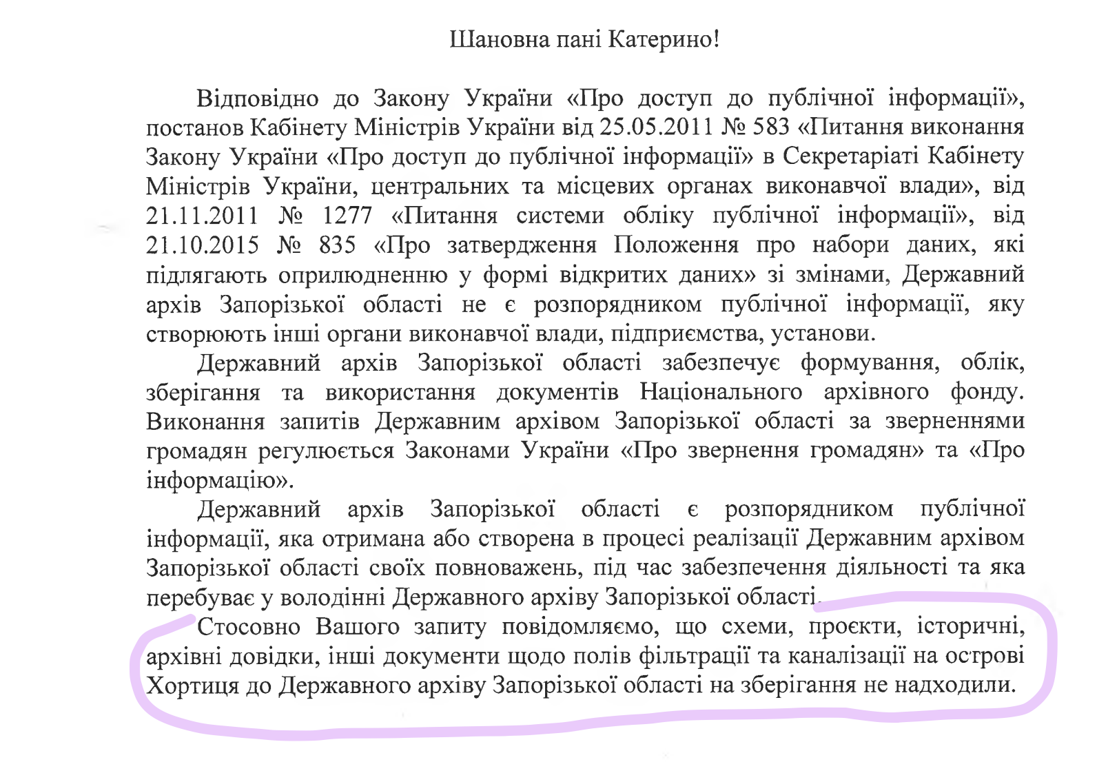 Державний архів відповів нам, що схеми, проекти, історичні, архівні довідки, інші документи щодо полів фільтрації та каналізації на острові Хортиця до Державного архіву Запорізької області на зберігання не надходили.