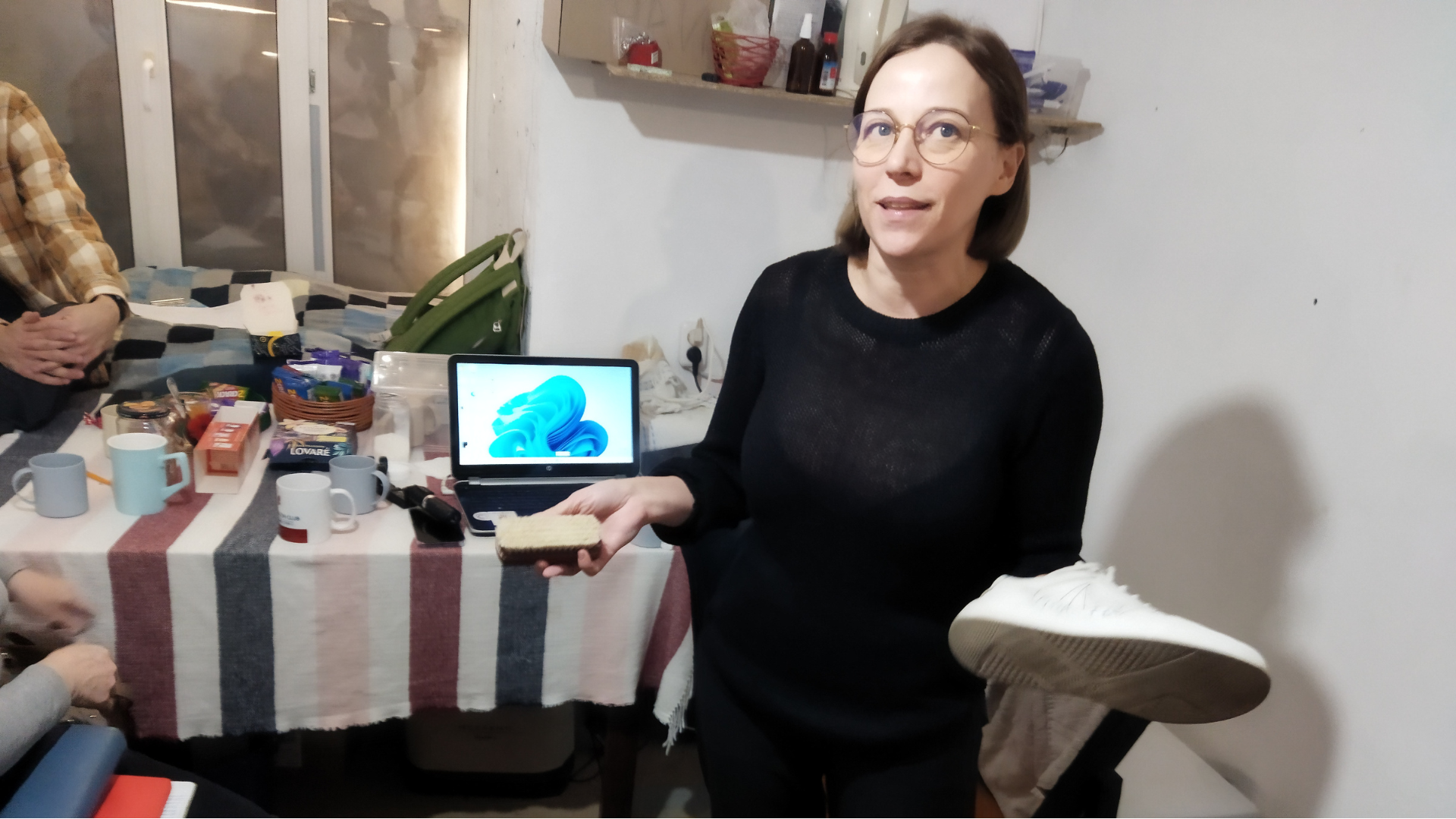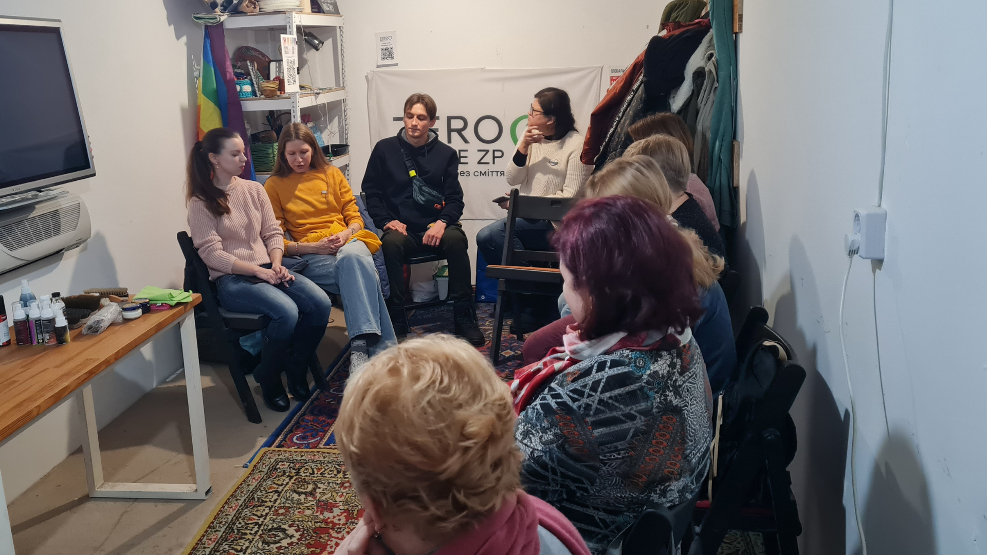 Усі уважно слухають жінку, що сидить на стільці біля стола з ноутбуком та щось розповідає, при цьому активно жестикулюючи. Це Анна Ткаченко, власниця запорізької майстерні з ремонту взуття «НАНОВО» та ведуча сьогоднішнього майстер-класу.