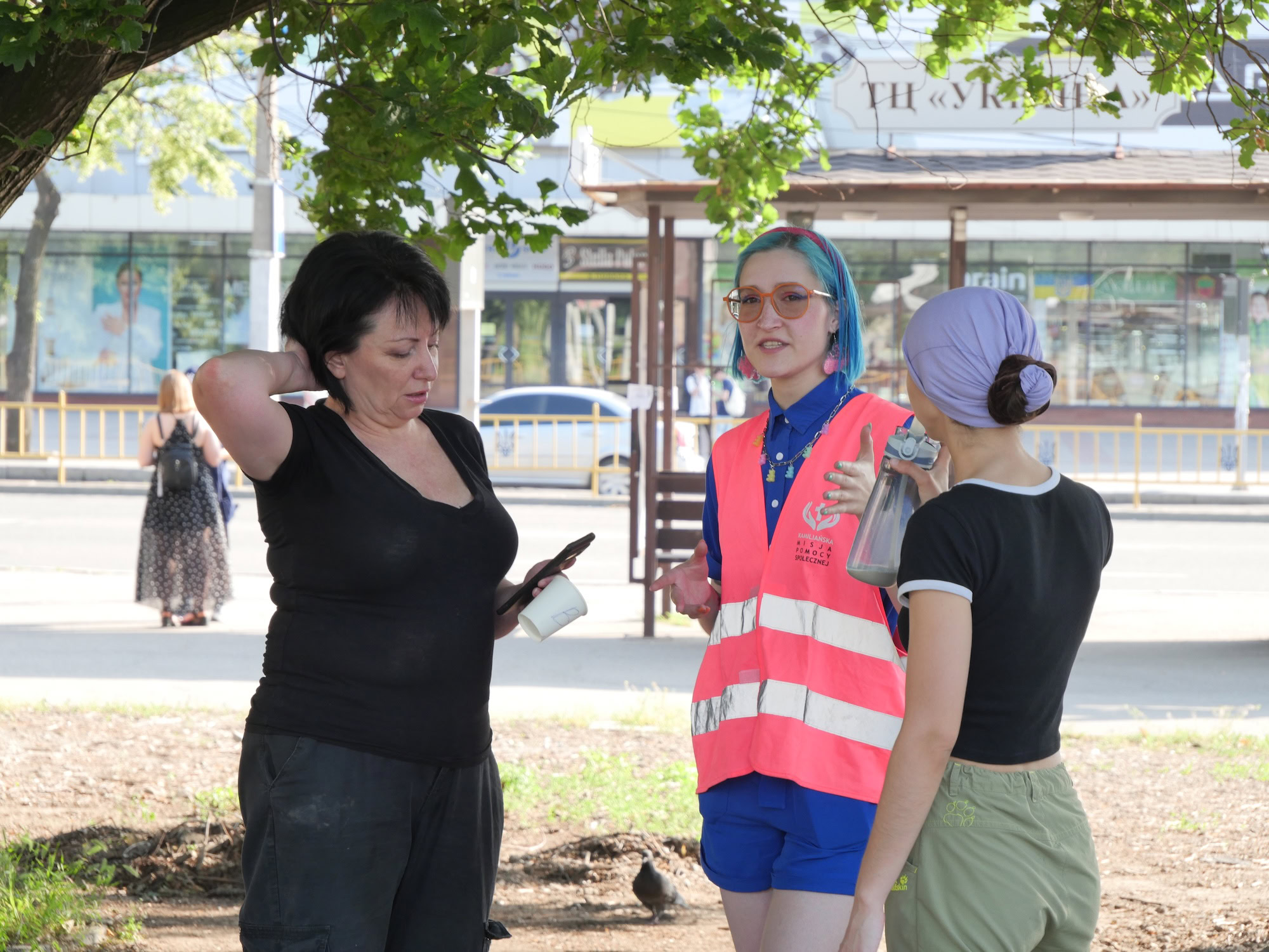 Після коротких інструкцій з прибирання парку та техніки безпеки з обрізання колючих дерев акацій і поводження під час повітряної тривоги учасники толоки підходять до столика, де беруть перчатки та інструменти, отримують завдання та приступають до роботи.