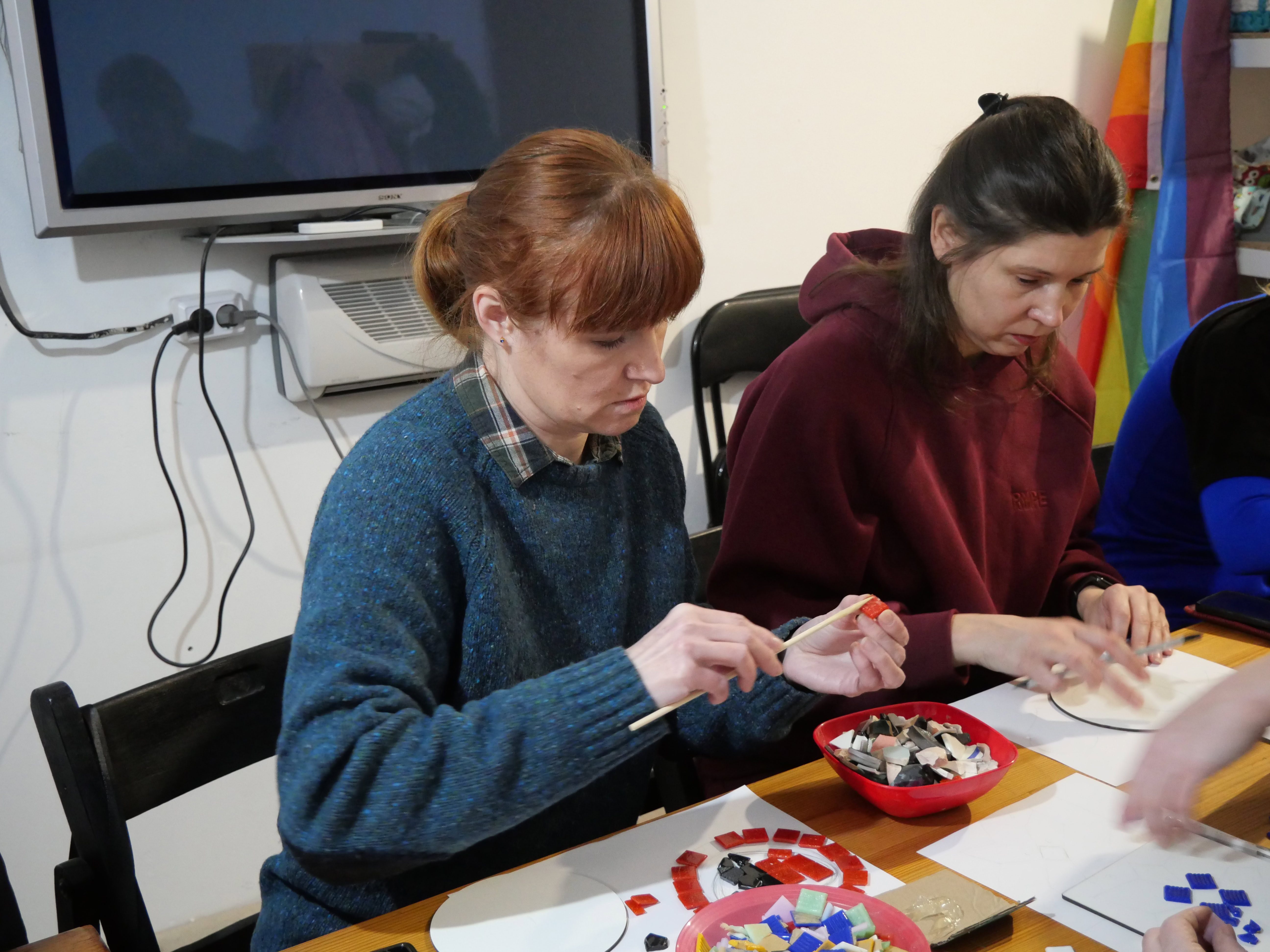 В невеличкій теплій кімнаті, за довгим столом, заставленим мисочками зі шматочками битого посуду, купою маленьких плиточок, якою частіше всього оздоблюють кухню чи ванну, зібралося з десяток людей, спраглих до творчості.