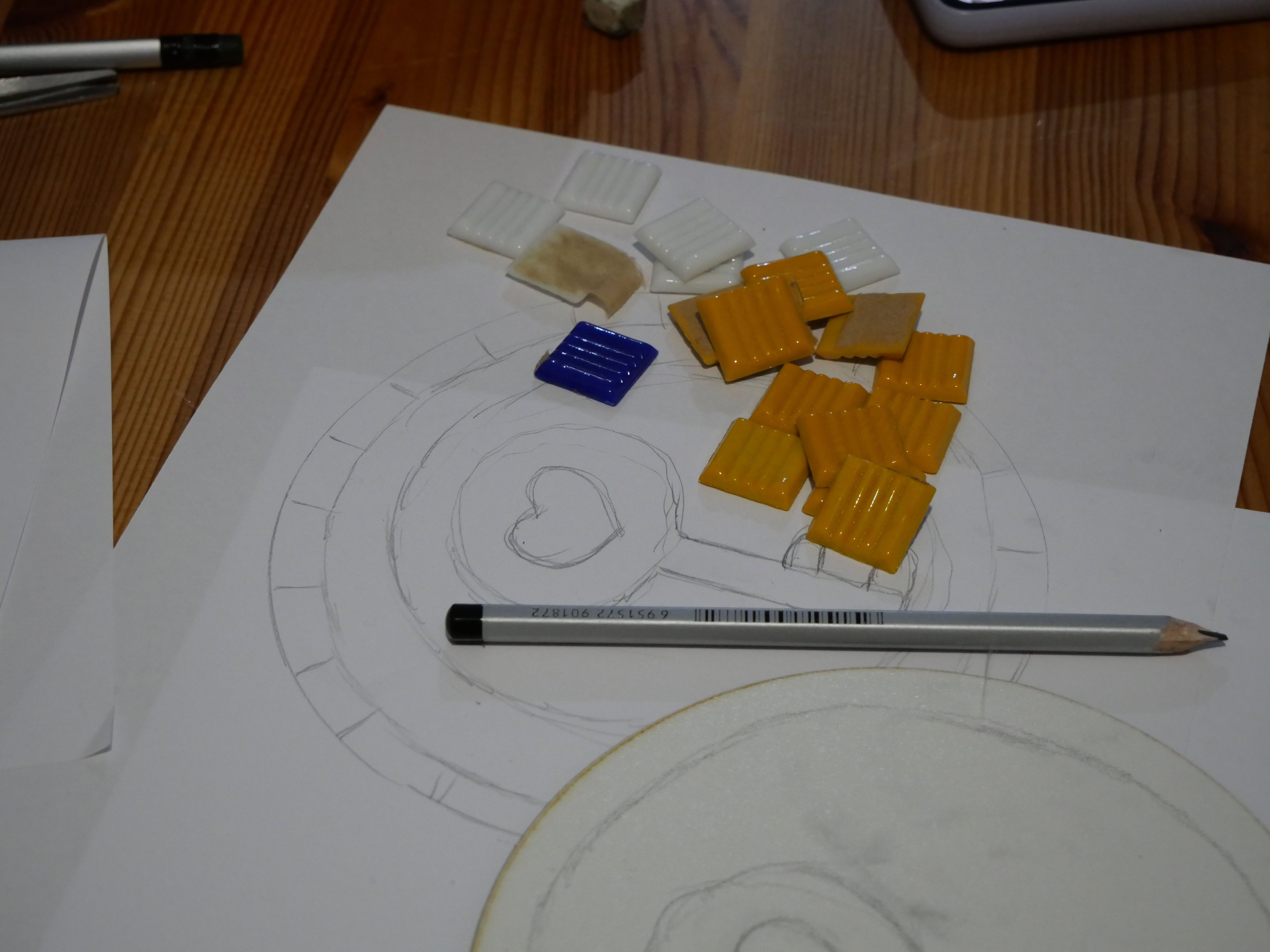 Разом з цим учасники беруть також і листочок просто паперу А4, щоб обвести на ньому форму і накидати ескіз. Як тільки ескіз готовий, його можна перенести на форму олівцем, щоб було легше розташовувати плитку.
