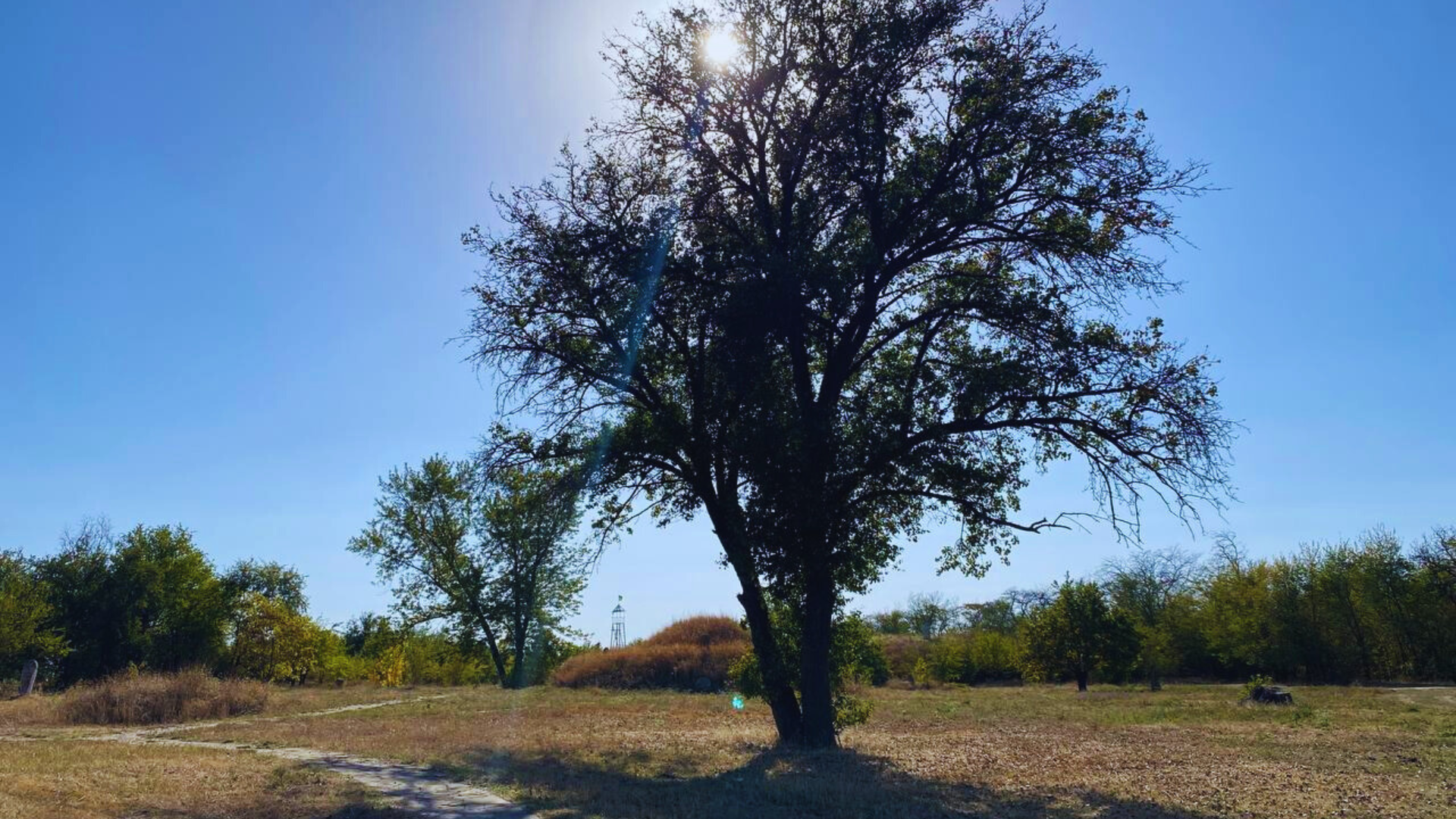 Проходимо трошки вглиб, бачимо будиночок з одиноким охоронником, а за ним кургани, між якими розкинув свої гілки, мов руки, що обіймають і бережуть таємниці наших предків, величний дуб.
