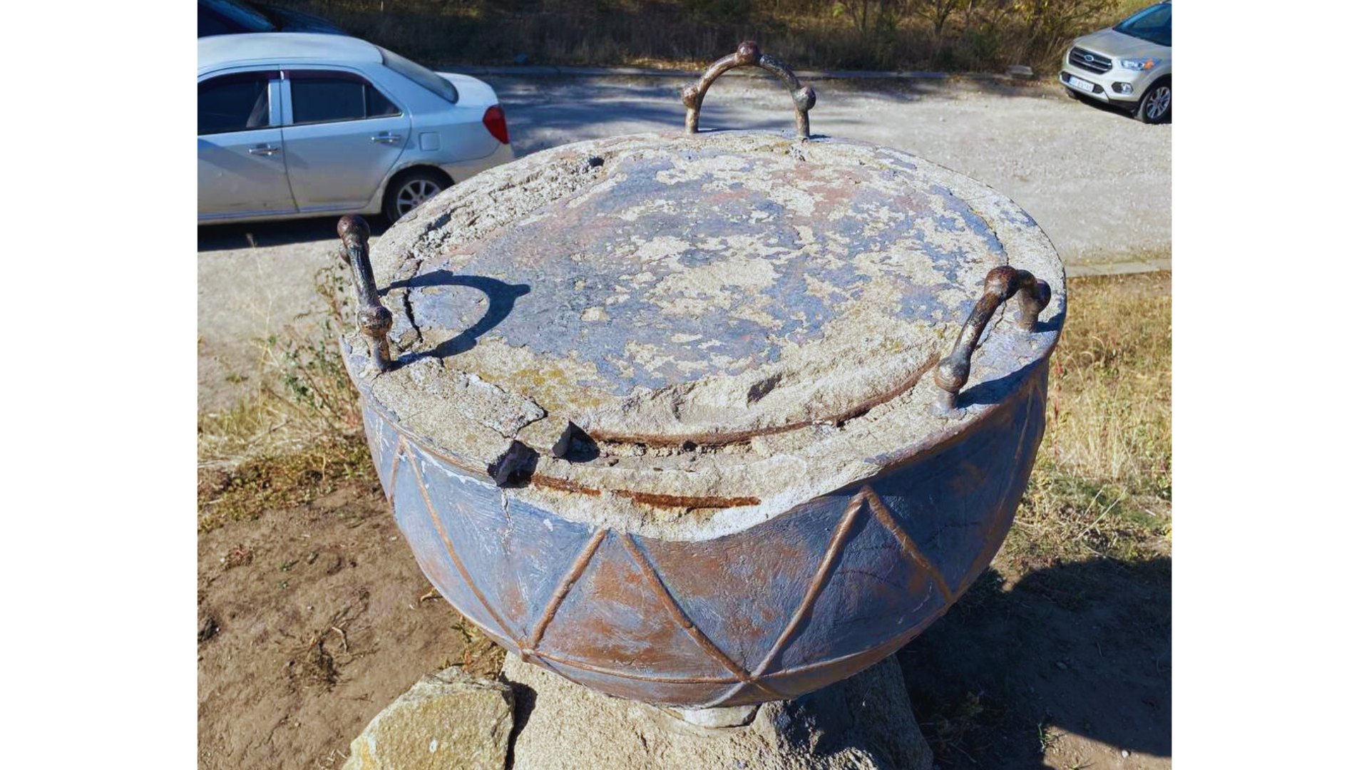 Паркуючи автівку, відразу звертаємо увагу на насип з дивною річчю. Виявляється, що це скіфський казан, який використовували для колективного приготування їжі.