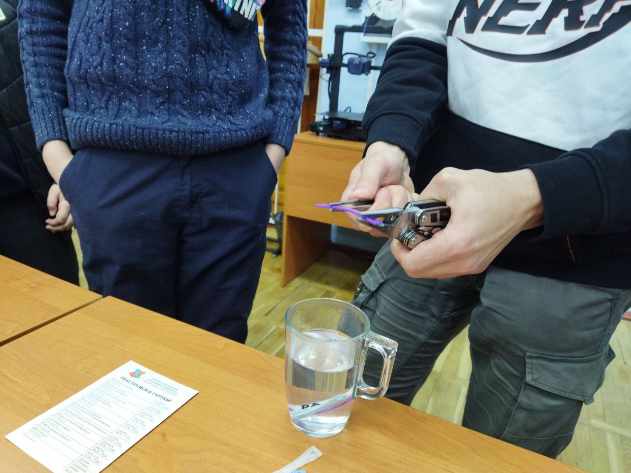 Далі викладач проводить експеримент. Він кладе у чашку щойно надруковані зразки з різних видів пластику, заливає їх окропом, трохи чекає, а потім дістає їх по черзі за допомогою кусачок та аналізує їхній стан на очах у зацікавлених підлітків.