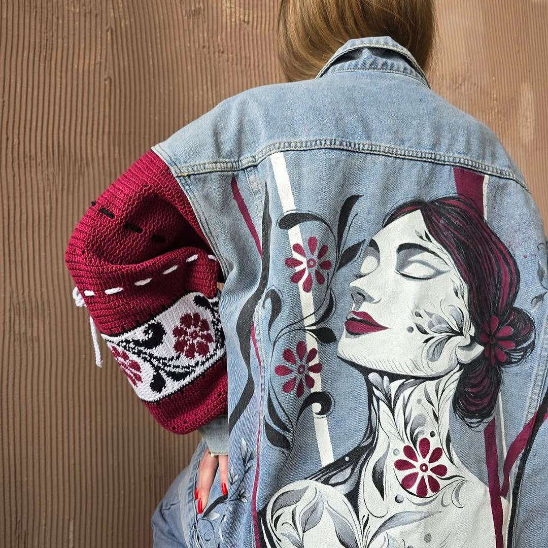 Першим виробом була звичайна джинсова куртка, яку Ілона та Вікторія кастомізували завдяки малюнку та в’язаним елементам.