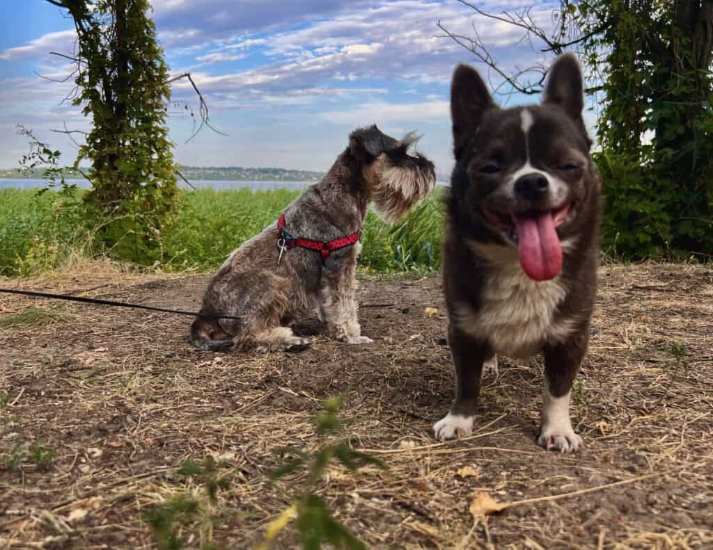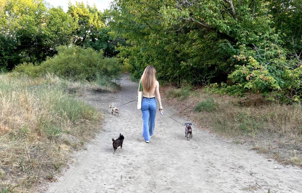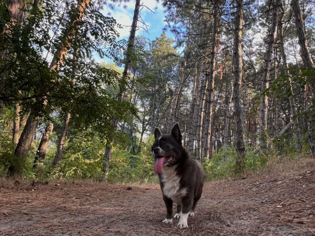 Сьогодні ми на прогулянці з песиками. Вже з перших кроків в «Сосенках» відчуваємо особливий аромат хвої. Тут атмосфера ніби занурює в інший світ – далеко від міської метушні. Про неї нагадує лише віддалений шум машин, що ледь доноситься з дороги поруч .
