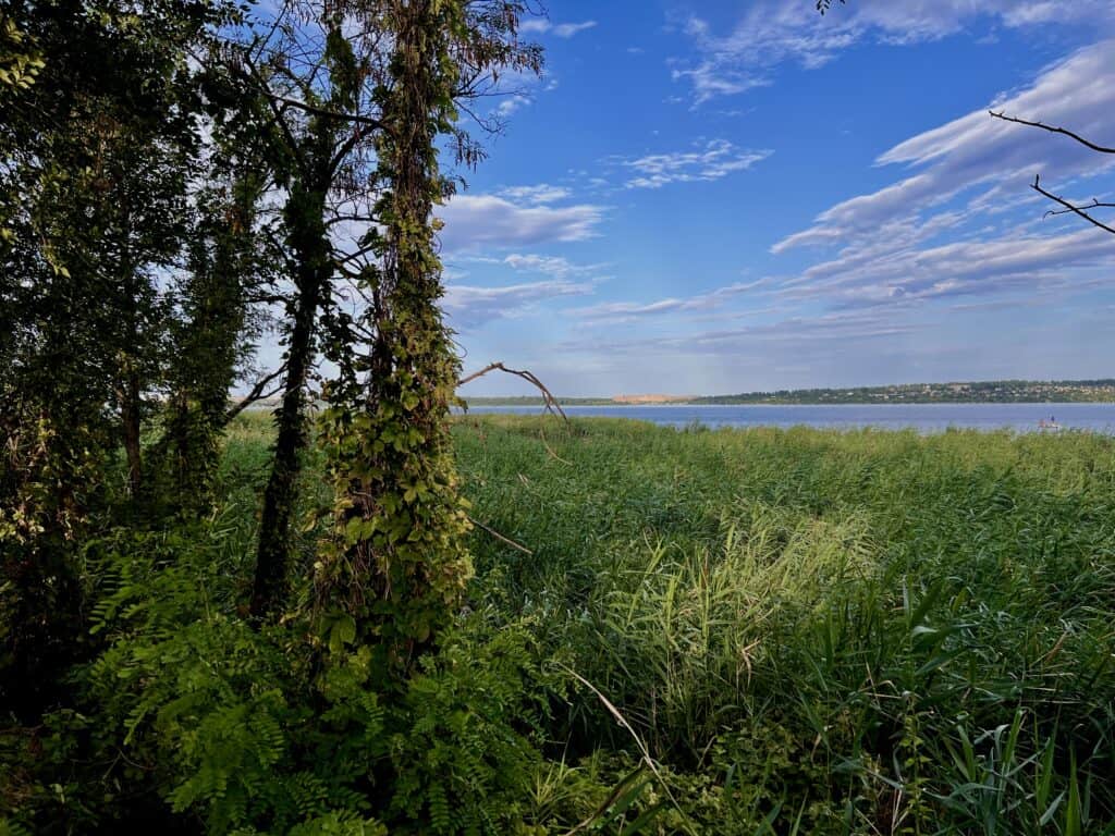 Дерева тут обплетені хмелем, і його тонкі зелені пагони тягнуться вгору, обіймаючи стовбури. Робимо паузу, роздивляємося протилежний берег Дніпра. На тому боці видніються будинки, які здаються крихітними через відстань. А також заводи, але тут ними навіть і не пахне.