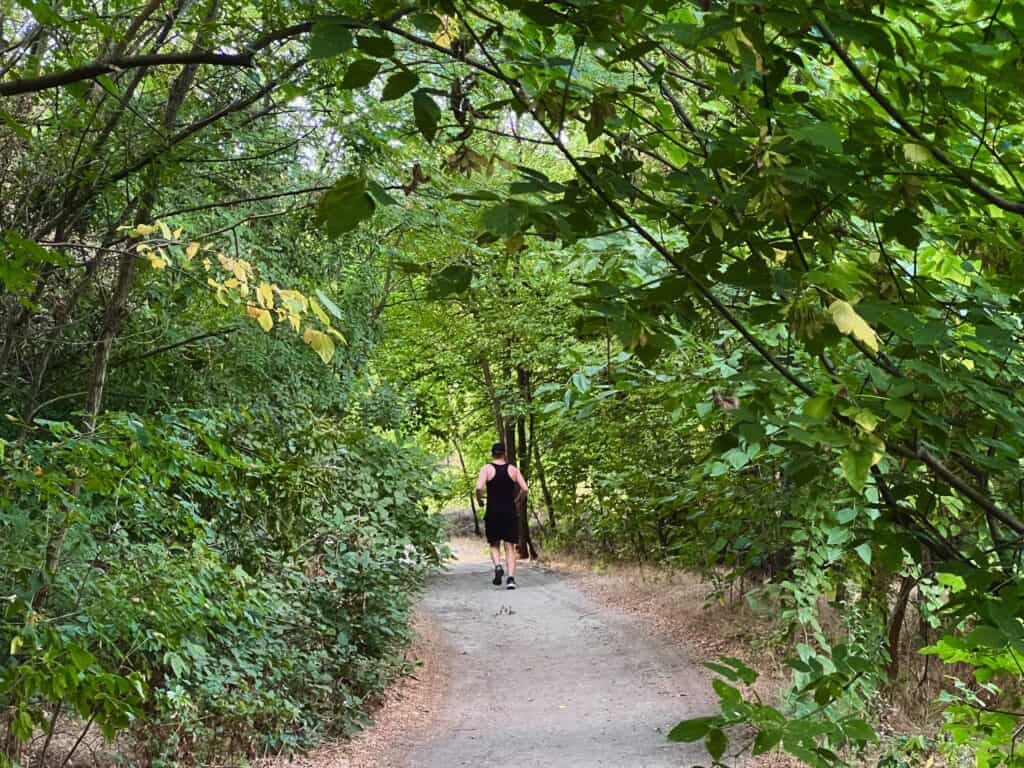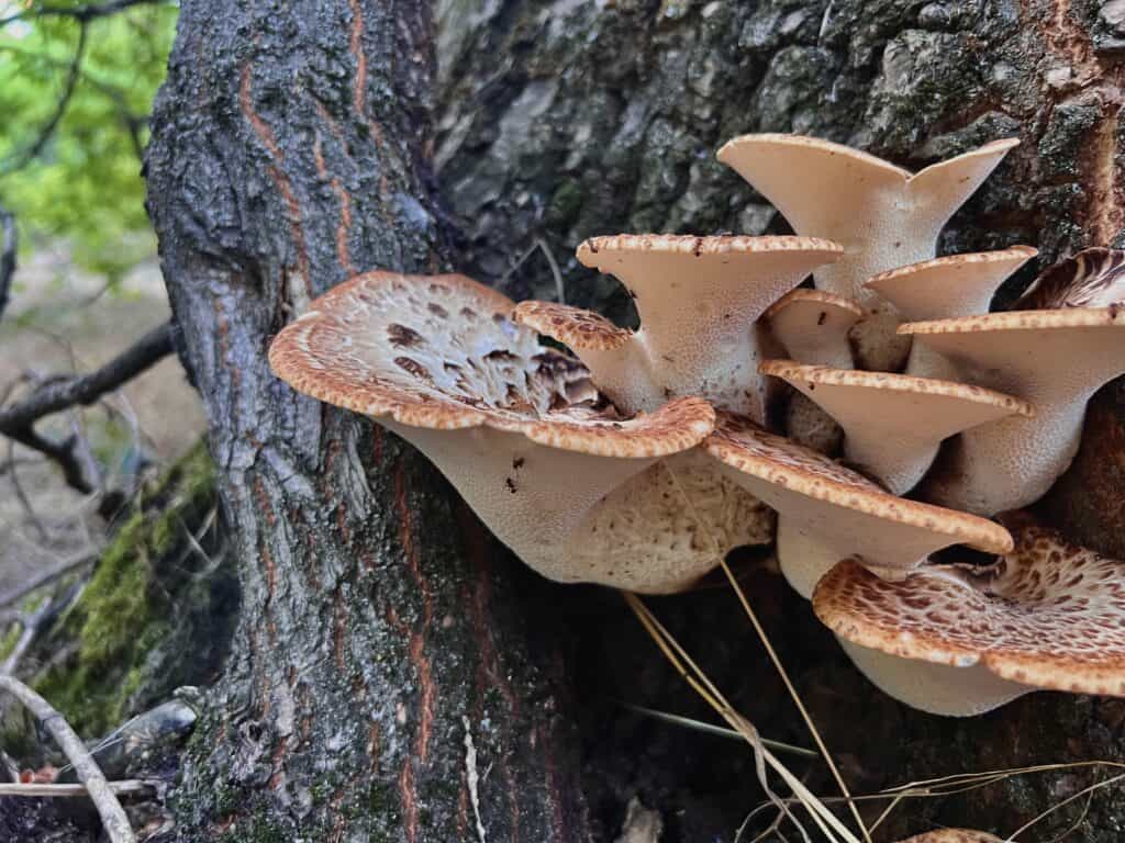 Тут розкинулося дерево, що поросло грибами (трутовиками лускатими) і мохом. У наш кадр потрапляє бігун. Водночас з тим, часто проїжджають велосипедисти, прогулюються люди зі своїми чотирилапими друзями. У лісі знайдеться місце для всіх.