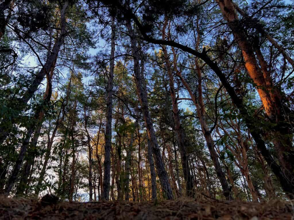 Це ідеальне місце для невеликого пікніка або просто для того, щоб спостерігати за життям річки і птахами. Однак сьогодні стежка веде нас далі через ряди сосен. Через кілька метрів вона плавно перетікає в іншу – до галявини, де вже листяні дерева й трав’янисті рослини займають своє місце окремо від хвойних гігантів.