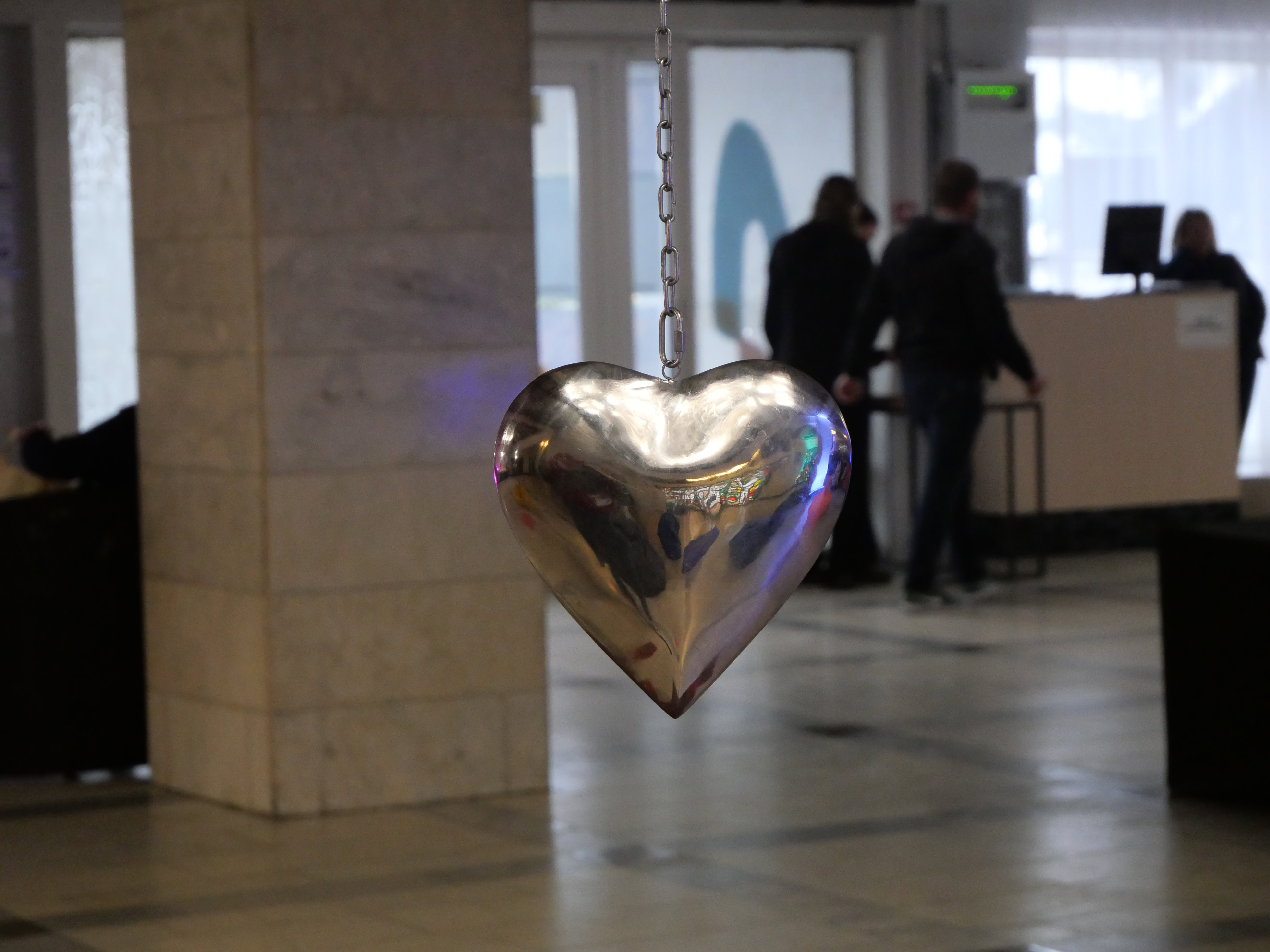 Поруч бачимо інсталяцію – килим, над центром якого висить металеве серце. Що це таке, не написано. Пізніше ми дізналися, що тут буде відбуватися перфоманс «Пульс довіри». Металеве серце, яке гойдається між учасниками перфомансу, символізує вразливість людських почуттів, поєднаних зі здатністю до взаємної підтримки та відновлення.