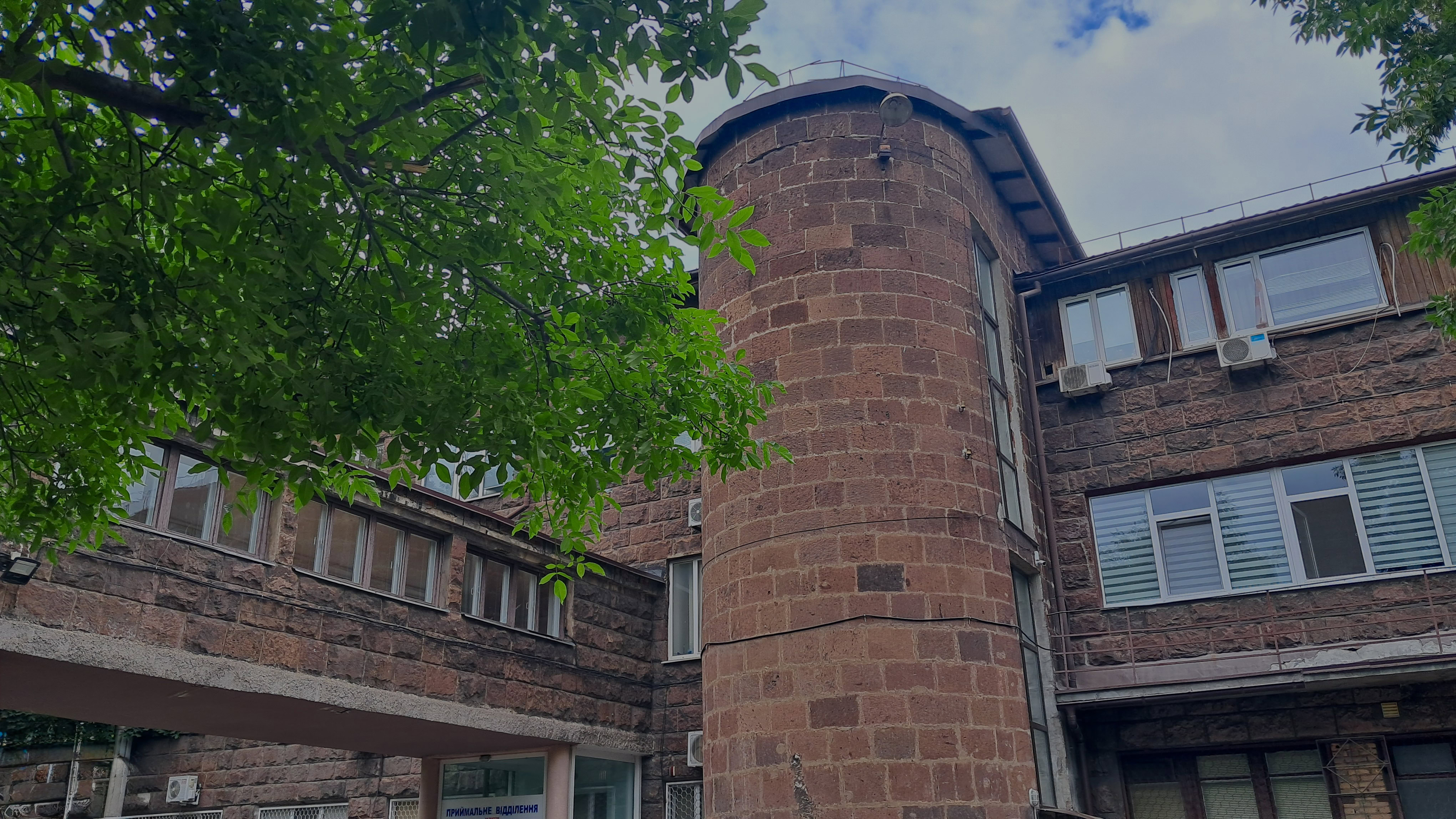 Проходимо вздовж проспекту Металургів, звертаючи праворуч, спостерігаємо побудови з темного вірменського туфу (або ще його називають «вірменський камінь» – це різновид гірської породи гірського типу, використовується для будівництва кам’яних споруд чи як облицювальний матеріал). Нас зустрічає лікарняне містечко.