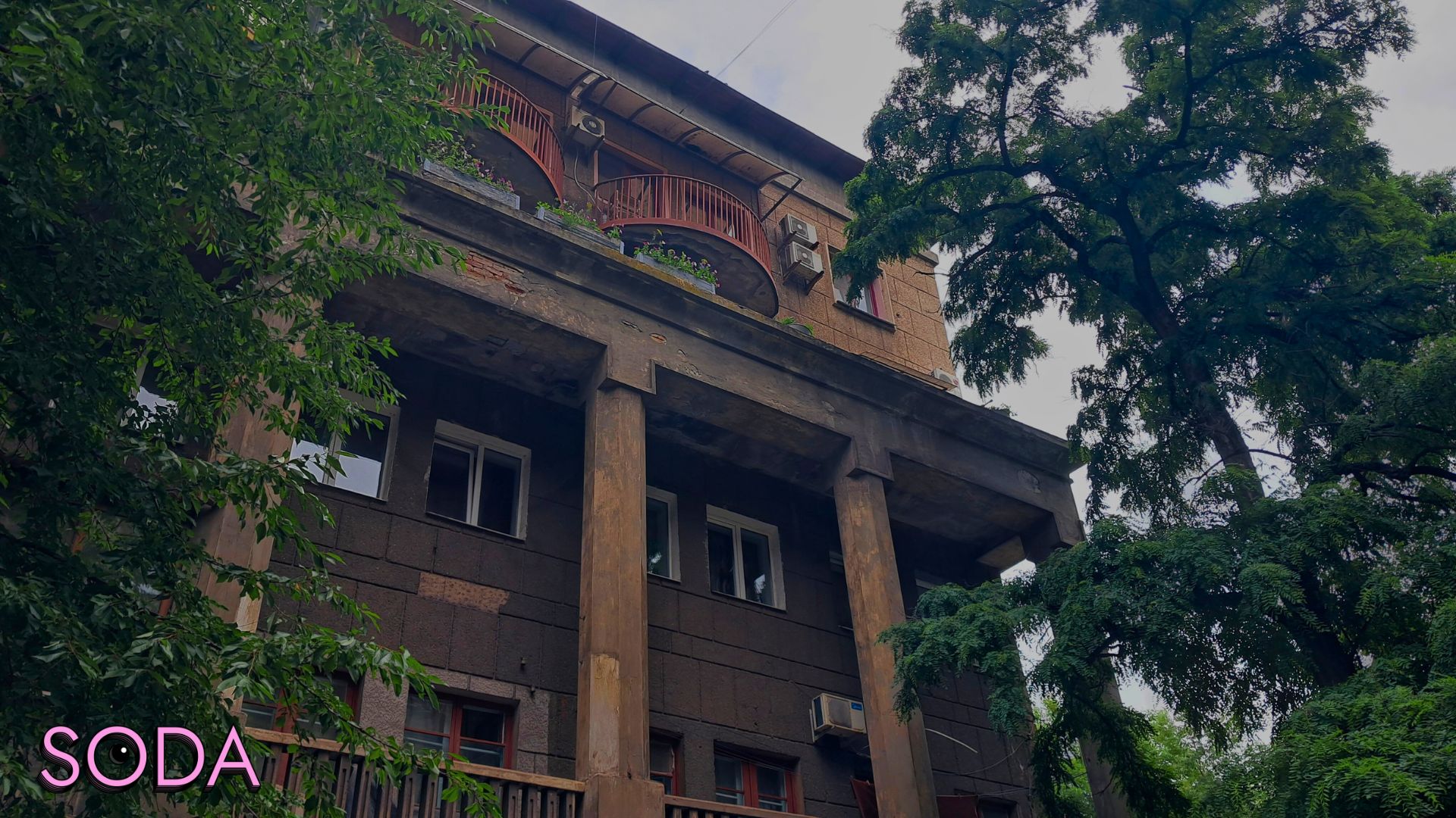 Раніше будинок-блок був з’єднаний з іншим гуртожитком, спроєктованим архітекторкою Ольгою Яфою. Два корпуси поєднувалися критим коридором, від якого нині збереглася лише невелика частина. Архітектори свідомо грали на контрасті: легка, біла штукатурка одного будинку протиставлялася темному об’єму сусідньої споруди, зведеної з вірменського каменю.