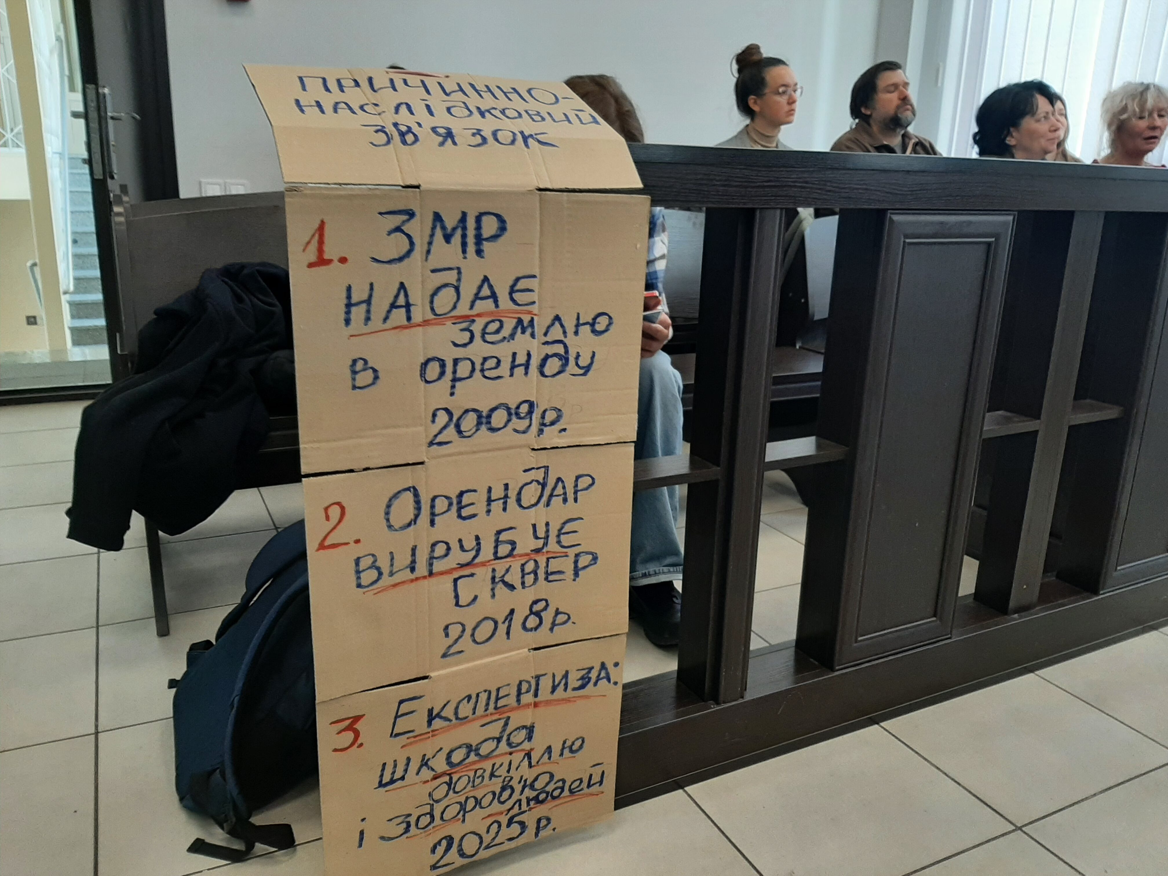 Також суд розглянув клопотання сторони позивача про додавання до справи нових доказів. Серед них – квитанція за оплату незалежного дослідження екосистеми до та після вирубки дерев у сквері. Також долучили витяг про трудову діяльність позивачки та відповідь на адвокатський запит про компенсаційну висадку.