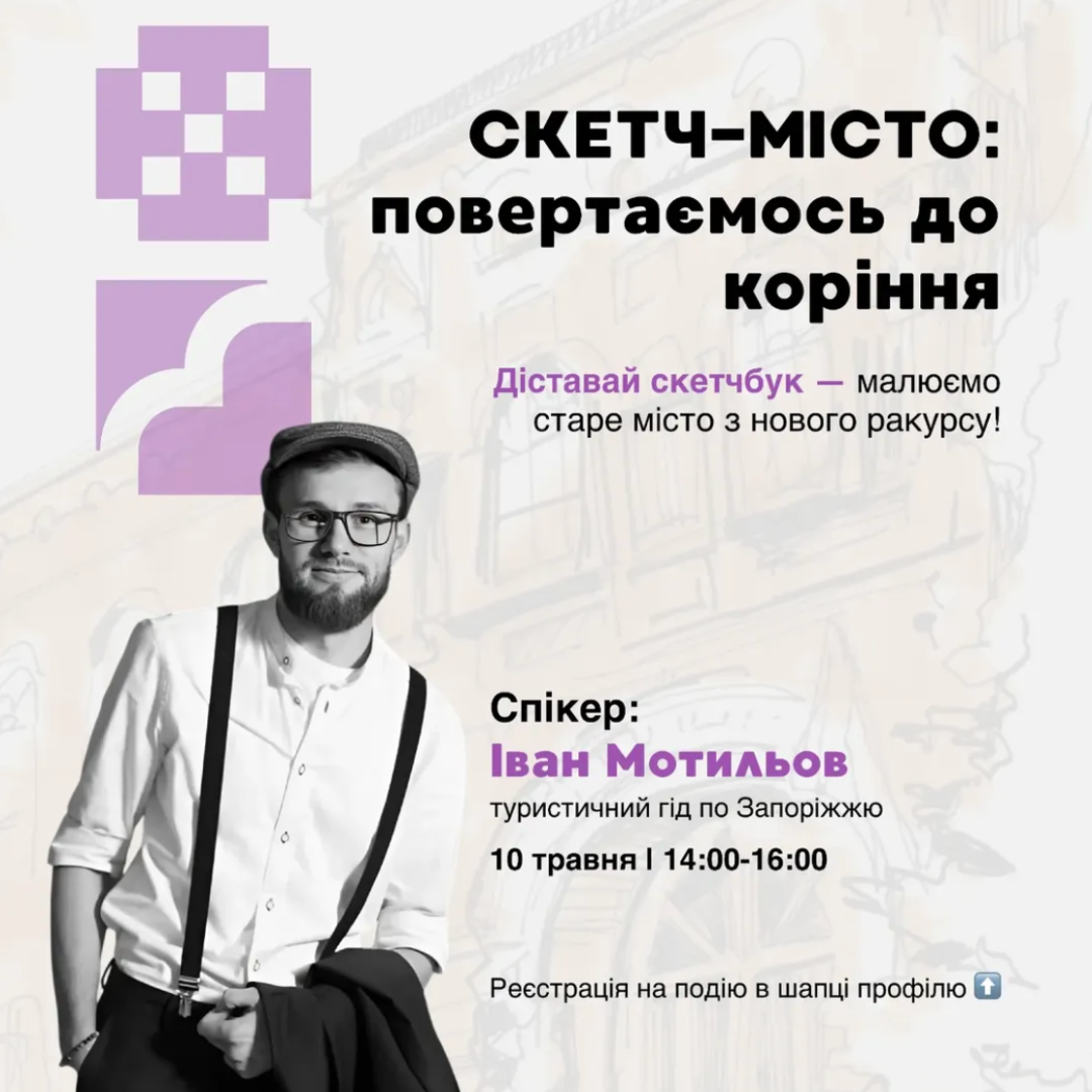 Міська прогулянка з гідом Іваном Мотильовим, присвячена архітектурі старого Запоріжжя. Учасників познайомлять з архітектурними деталями, що зазвичай залишаються поза увагою. Організатори радять взяти з собою скетчбук, ручки, олівці, воду.
