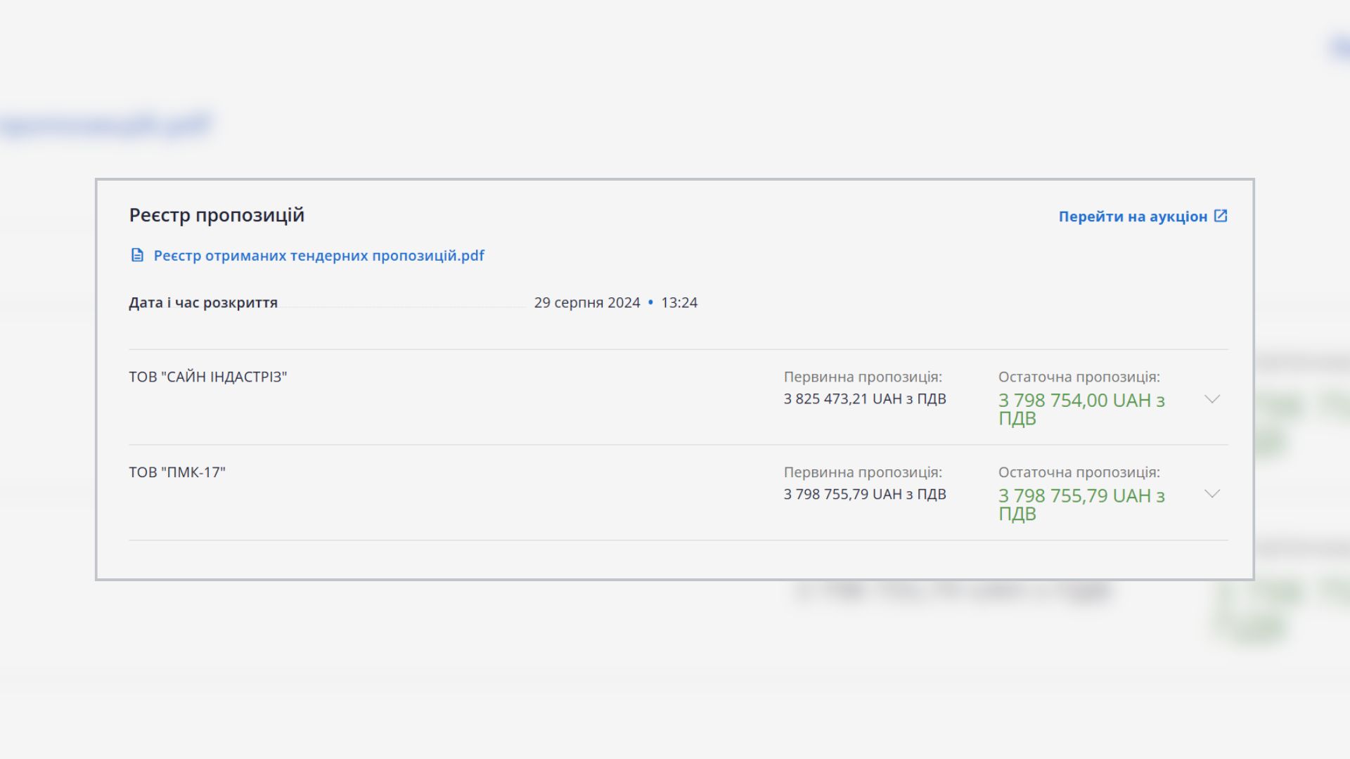 На конкурс подалися дві фірми. ТОВ «ПКМ-17» згодилася зробити ремонт за 3,7 мільйона гривень, а ТОВ «Сайн Індастріз» ще на 4 тисячі дешевше. Остання фірма стала переможцем.