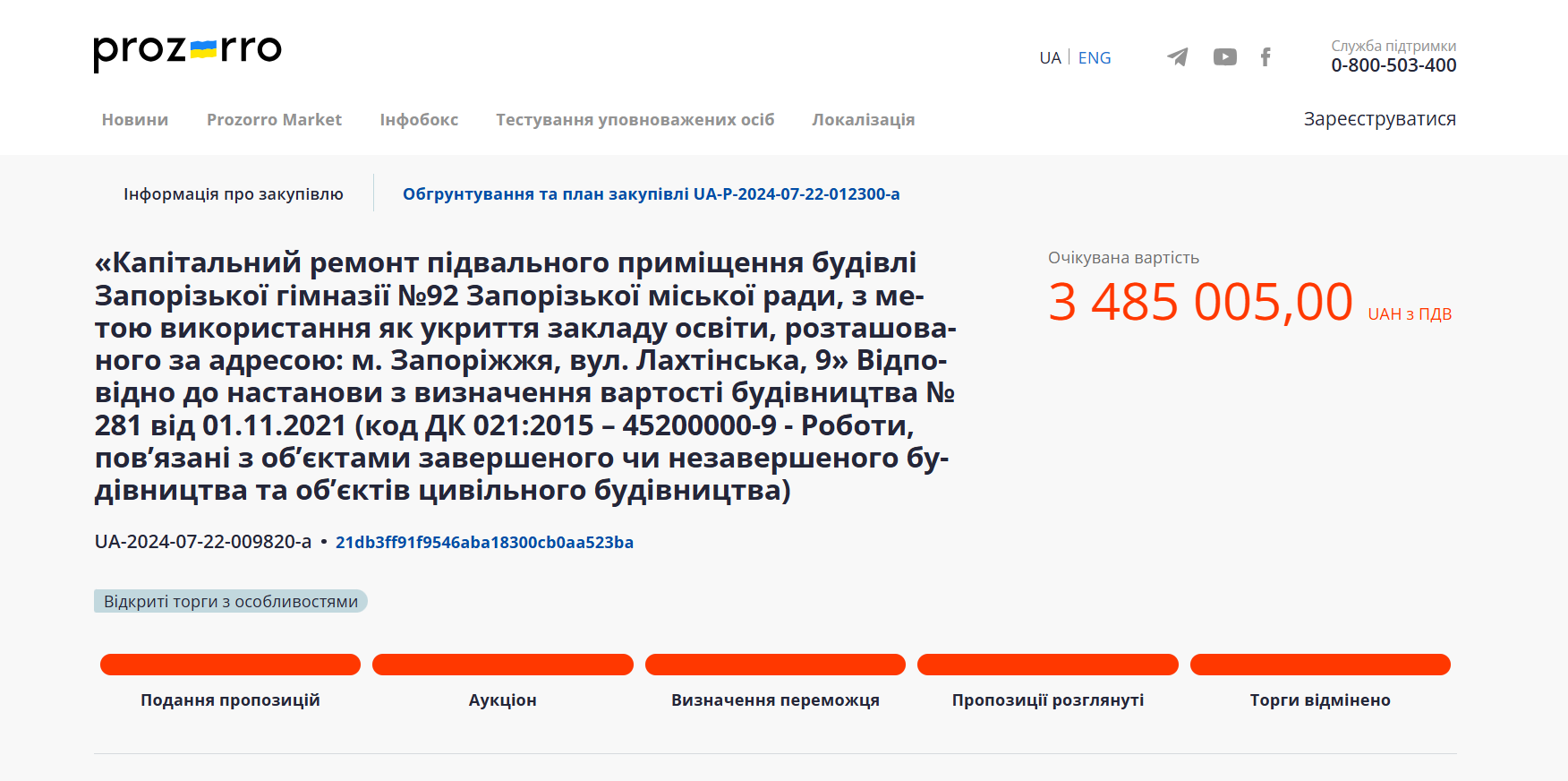 Першу закупівлю по капітальному ремонту укриття школи оголосили 22 липня 2024 року. Капремонт оцінили в 3,4 мільйона гривень. Але скасували через невідповідність вимогам законодавства.