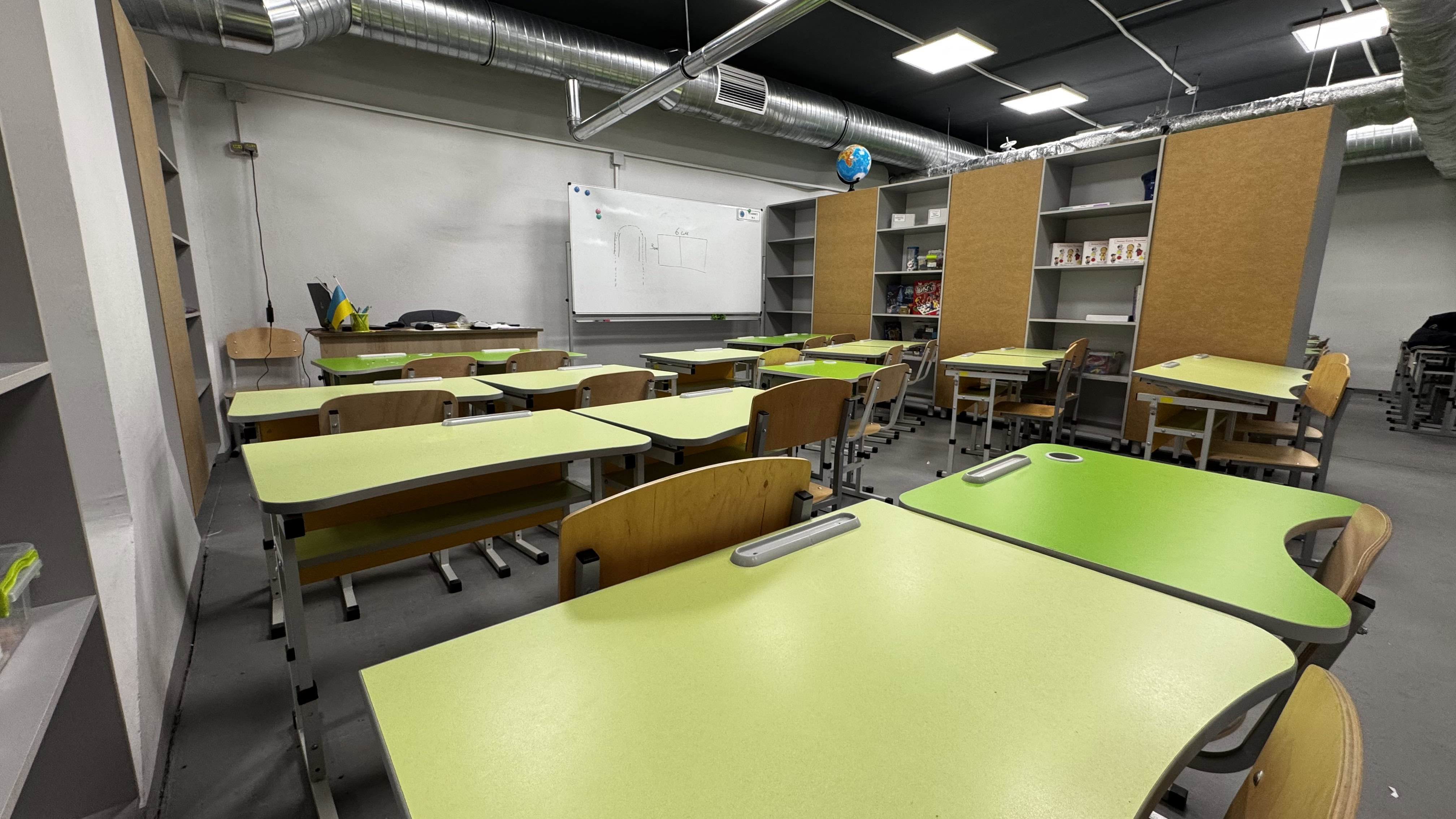 Для імітації стін встановлені шафи. Тому можна сказати, що учні вчаться в одній великій аудиторії. До 1 вересня в укритті планують облаштувати ще одну велику кімнату. Там, за словами директорки Ірини Суліни, перестінки проєктом передбачені.