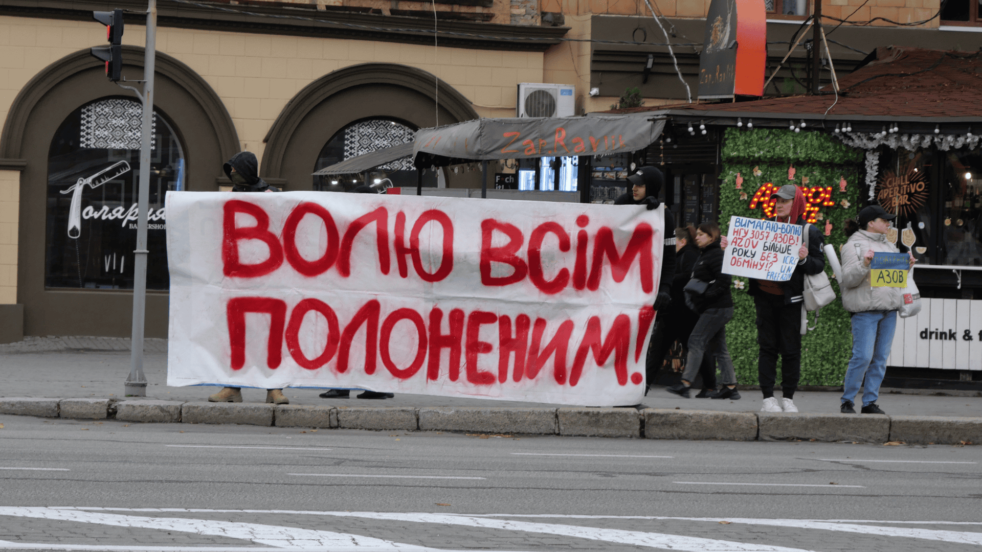 Декілька десятків людей розмістилися вздовж проспекту з плакатами: Волю всім полоненим, Поверніть полонених та зниклих безвісти, Вони досі в полоні, Борись за них так, як вони боролися за нас, Free Azov. На деяких плакатах були роздруковані фото українських захисників.