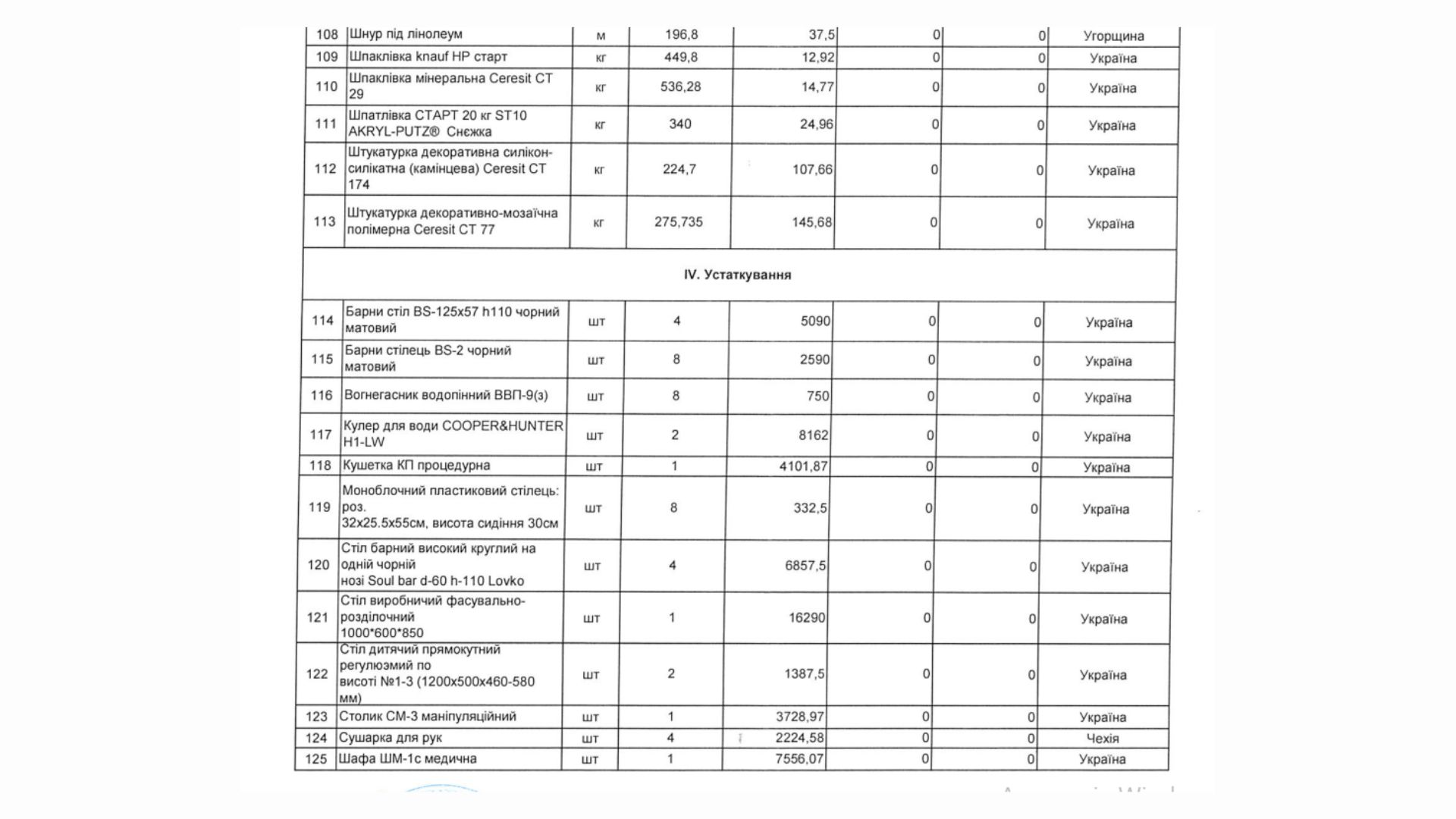 Незначна кількість від суми піде на меблі та технічне оснащення, такі як барні столи й стільці, кушетки, дитячі столи, маніпуляційні столи, кулер для води, сушарка для рук та вогнегасники.