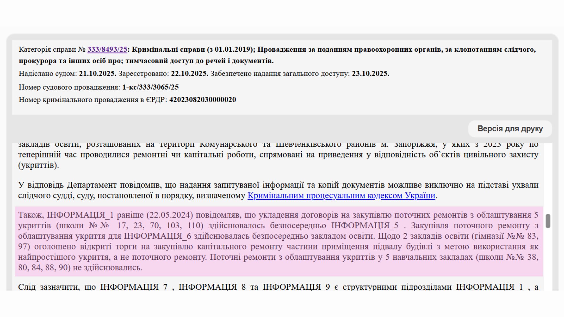 Комунарський районний суд Запоріжжя не задовольнив клопотання поліції про тимчасовий доступ до документів Департаменту освіти та підпорядкованих йому шкіл у справі про можливі зловживання під час ремонтів укриттів