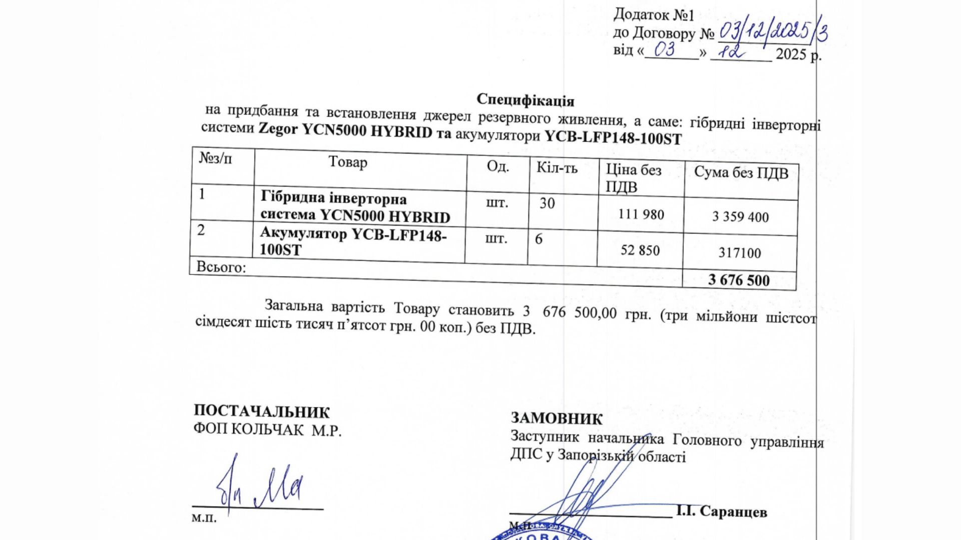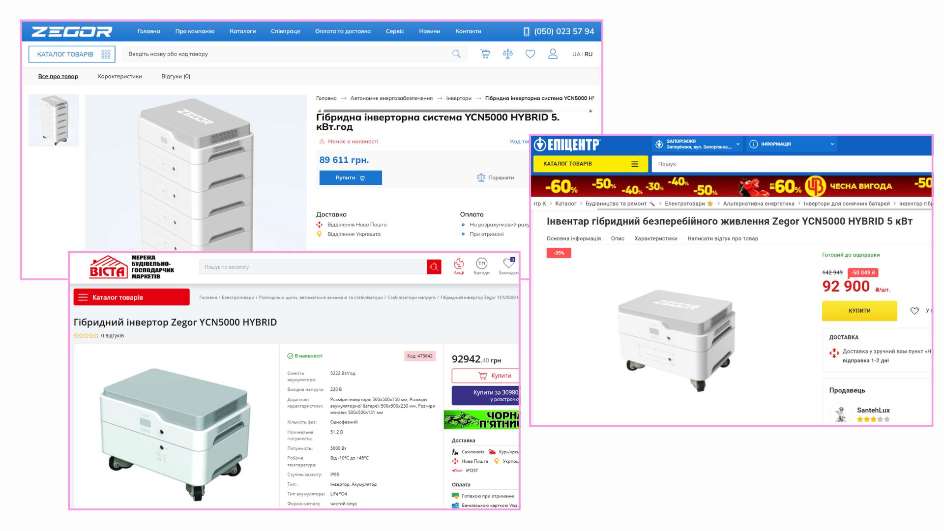 Наприклад, гібридна інверторна система «Zegor» YCN5000 HYBRID коштує в магазинах «Zegor», «Епіцентр», «Віста» в межах 90-93 тис. грн, тоді як у договорі вартість однієї одиниці становить близько 111 тис. грн. Переплата за 30 штук набігла до 570 тисяч.