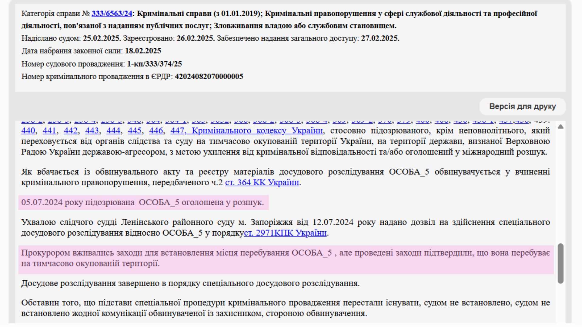 Досудове розслідування почали у 2023 році. З липня 2024 року справу скерували до суду. Через те що Безбородих не виходила на зв’язок, її оголосили в розшук. Згодом правоохоронцям вдалося підтвердити факт перебування обвинуваченої на тимчасово окупованій території. Суд вирішив розглядати справу без обвинуваченої.