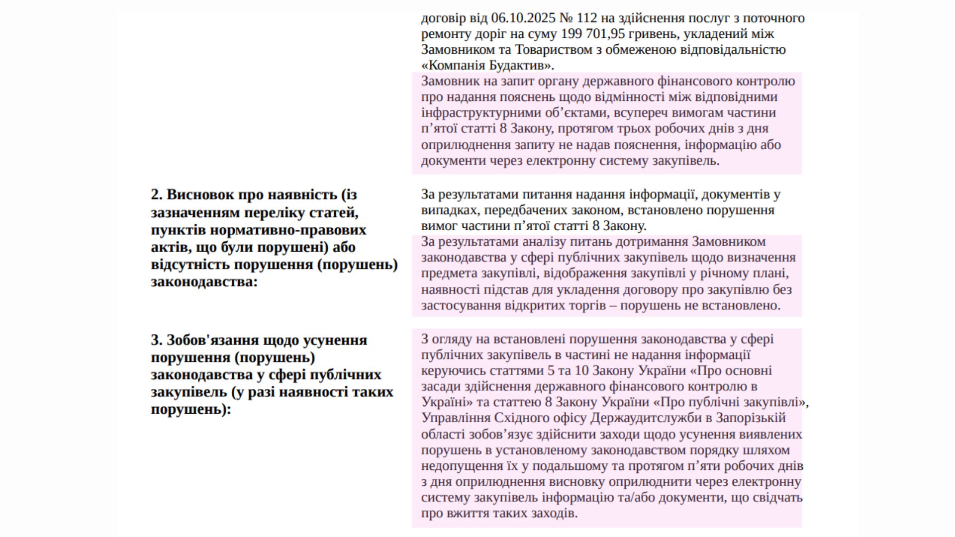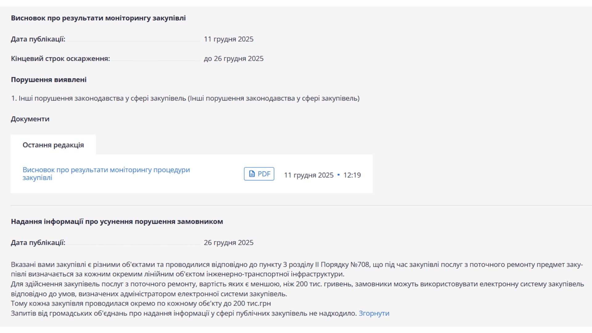Окремо аудитори звернули увагу на те, що у жовтні 2025 року замовник провів одразу кілька закупівель, пов’язаних із ремонтом доріг, які за класифікатором належать до одного типу інфраструктурних об’єктів. Тому аудитори попросили пояснити, які саме відмінності між цими об’єктами, зокрема місце розташування, технічний стан, обсяги або умови виконання робіт стали підставою для проведення кожної закупівлі окремо, а не в межах однієї процедури.