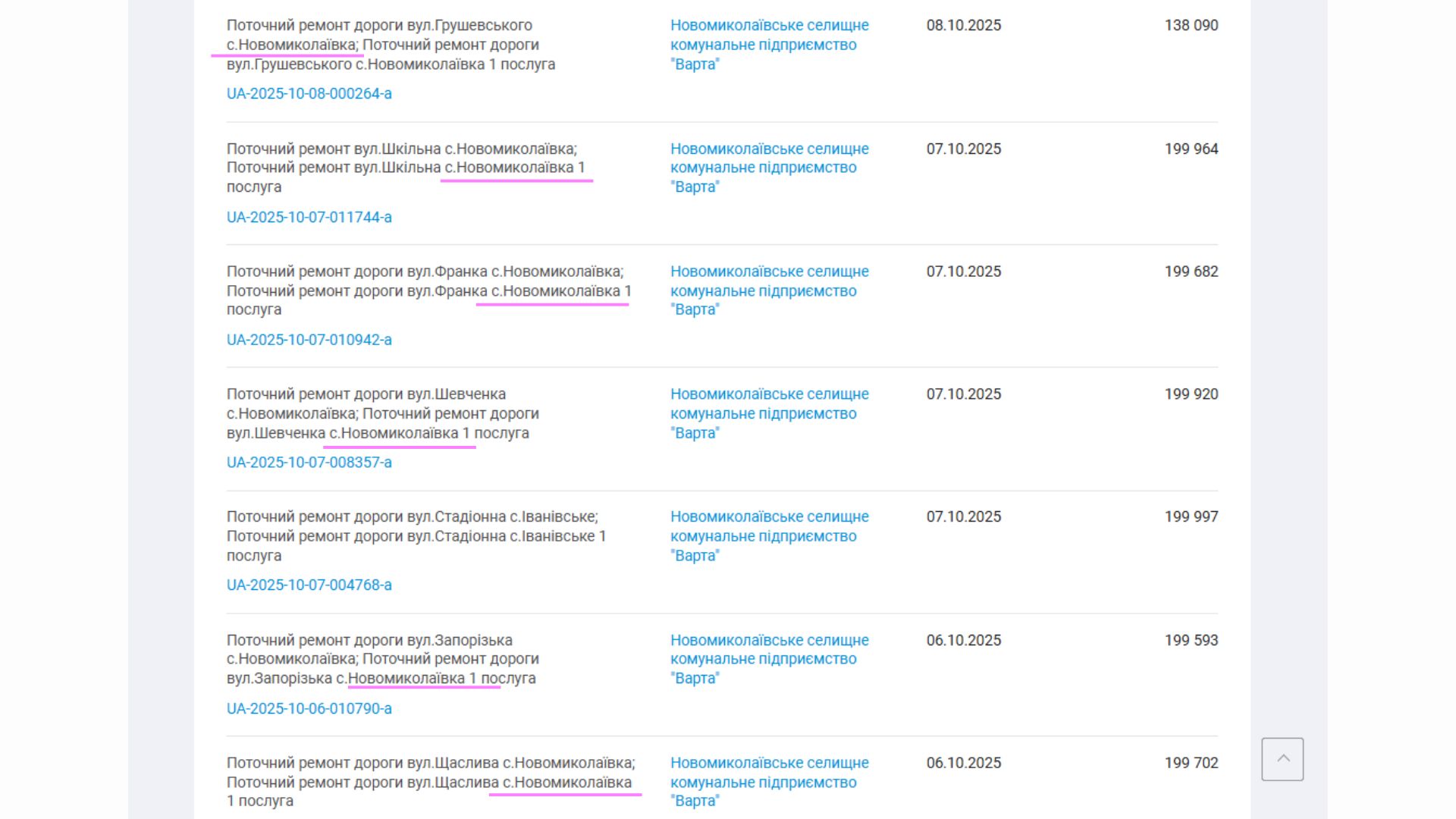 В жовтні SODA писала про поточні ремонти вулиць у селах Новомиколаївської громади, які проходять без торгів та конкуренції. В межах моніторингу використання бюджетних коштів ми виявили ознаки можливих порушень у сфері публічних закупівель: