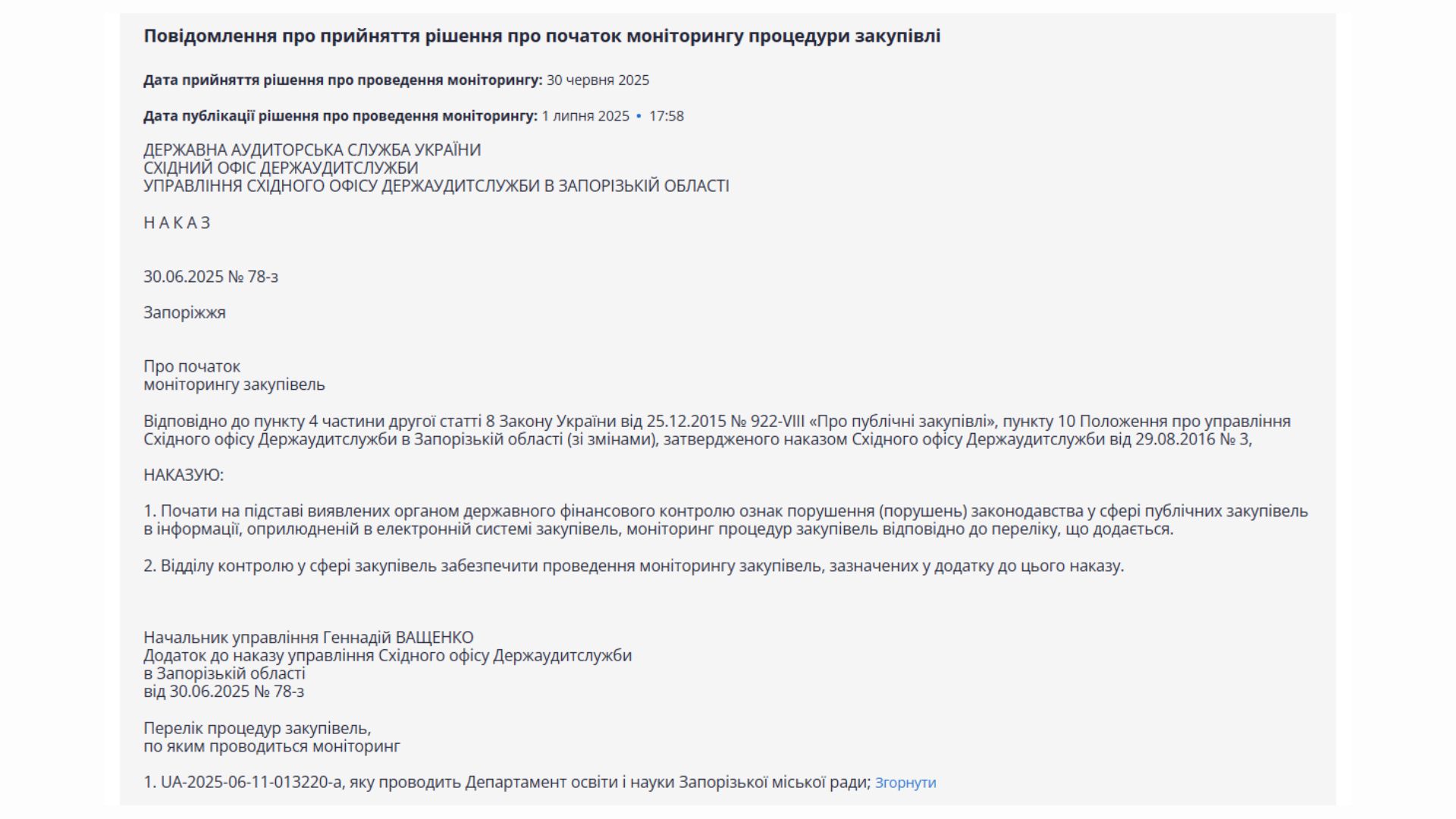 29 липня 2025 року Департамент освіти подав позов до Запорізького окружного адміністративного суду, у якому просив визнати протиправним і скасувати висновок моніторингу закупівлі, оприлюднений Східним офісом Держаудитслужби.