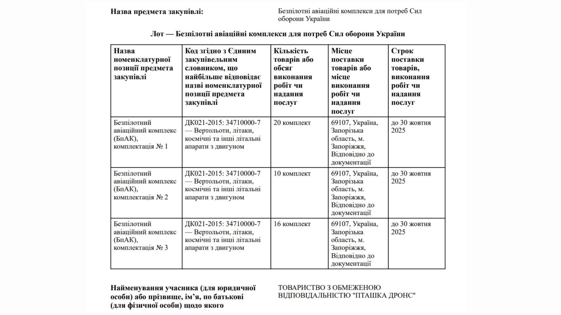 На початку вересня Управління оборонної роботи Запорізької обладміністрації оголосили закупівлю БпЛА на 39 мільйонів. На конкурс подалися три київські фірми: «Флай Сістемс» запропонувала послугу за 38 мільйонів, «ОШЕННОН-Трейд» – за 37 мільйонів. Найдешевшу ціну принесла фірма «Пташка Дронс» – 35 мільйонів, яка і стала переможцем торгів.