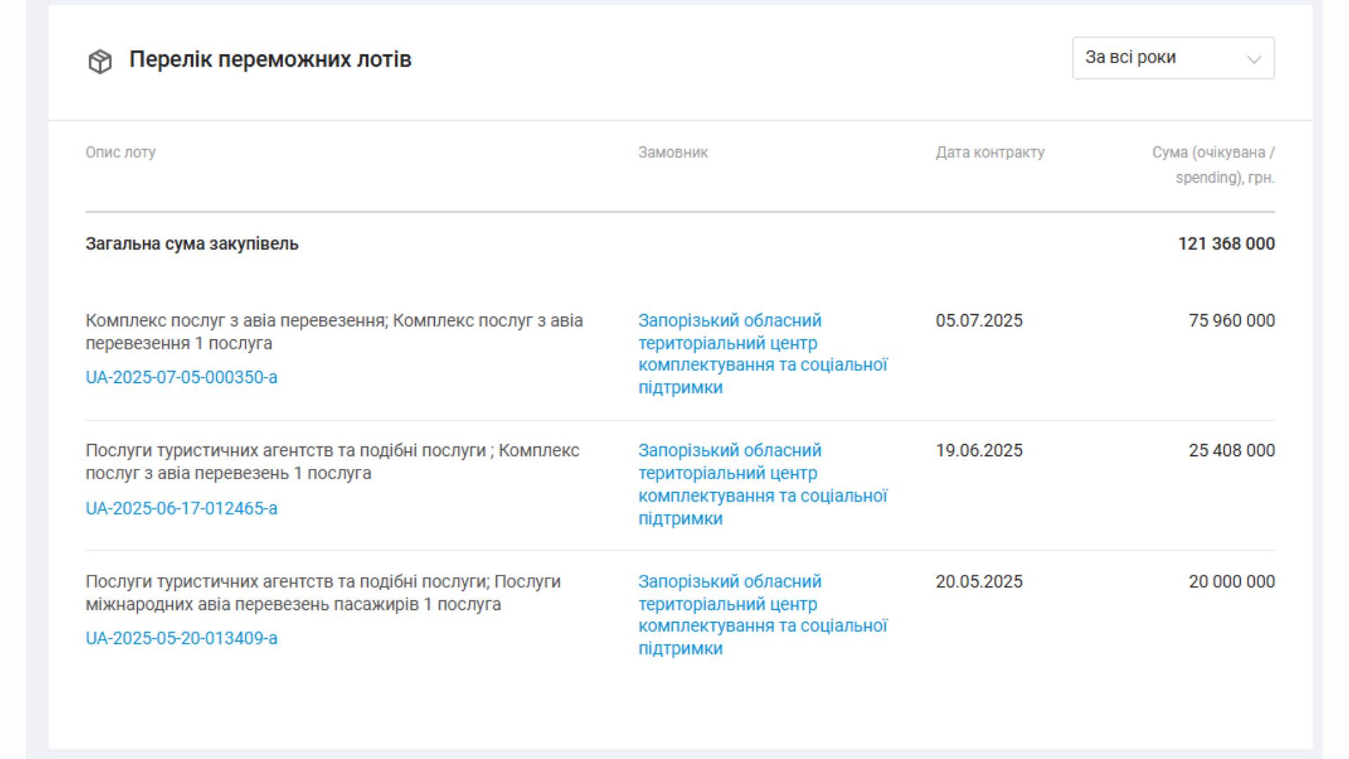 П’ятірку відкриває закупівля для потреб оборони. Обласний військкомат замовив послугу за 100 мільйонів гривень авіаперевезення іноземних добровольців для служби в ЗСУ. Сюди відносяться авіаперельоти, харчування та проживання в готелі. Переможцем закупівлі стала київська фірма «Флай-Технікс».
