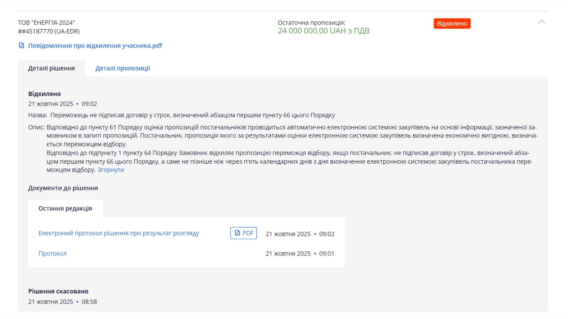 Запорізьке комунальне підприємство міського електротранспорту «Запоріжелектротранс» оголосило закупівлю на дизельне паливо 9 жовтня. На конкурс прийшло три фірми. Запорізька фірма «Енергія-2024» запропонувала виконати завдання закупівлі за 24 мільйонів, київська фірма «Веллойл» за 24,9 мільйонів. Інша запорізька фірма «Промпеторл» за 24,99 мільйонів.